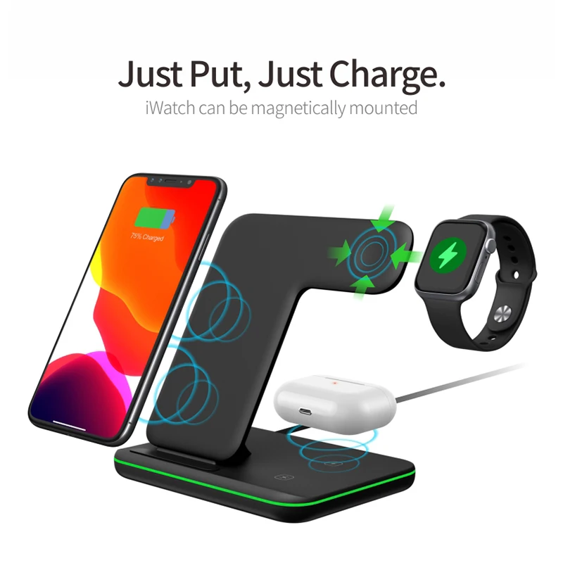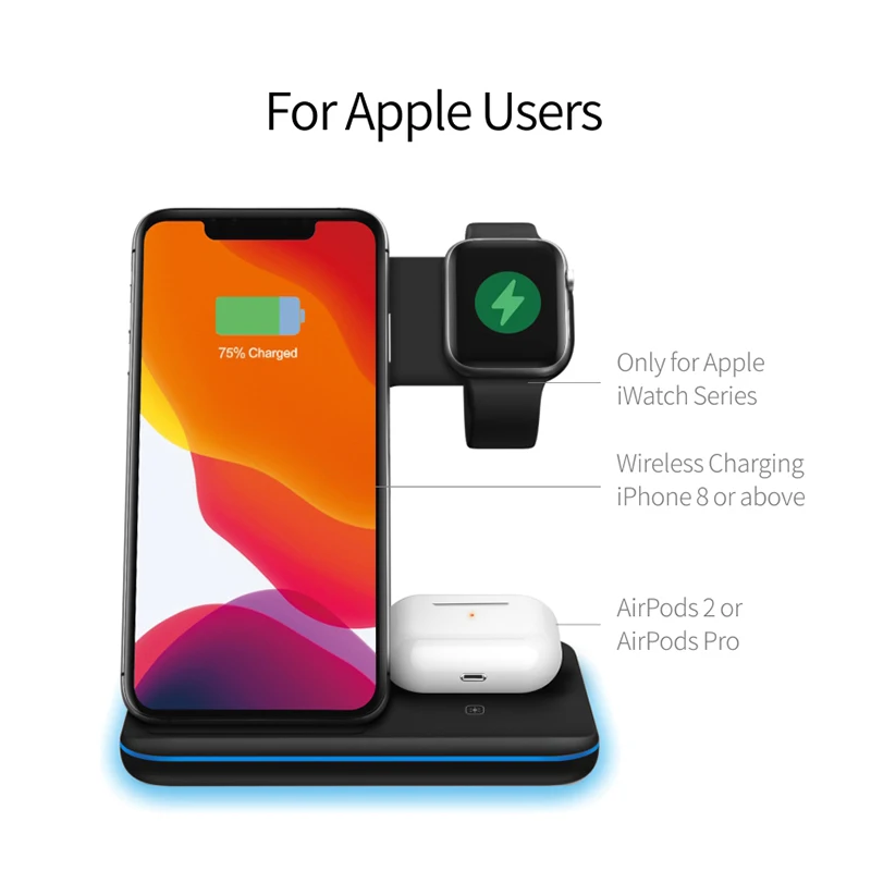 Характеристика:1. Это Беспроводное зарядное устройство 3-в-1 поддерживает смартфон и подходит для apple Watch 2/3/4/5.