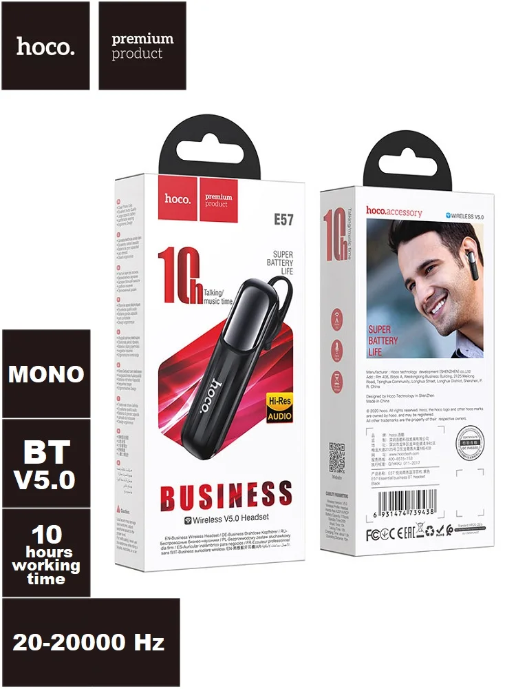Bluetooth гарнитура HOCO E57 Essential BT 5.0, моно, вкладыши (черный)