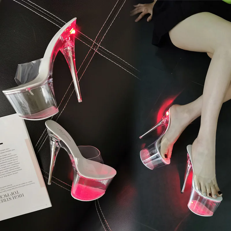 Женские тапочки из прозрачного ПВХ с мигасветильник, летняя прозрачная обувь на высоком каблуке 17,5 см, уличные светящиеся тапочки на платформе с кристаллами