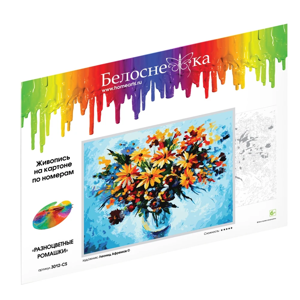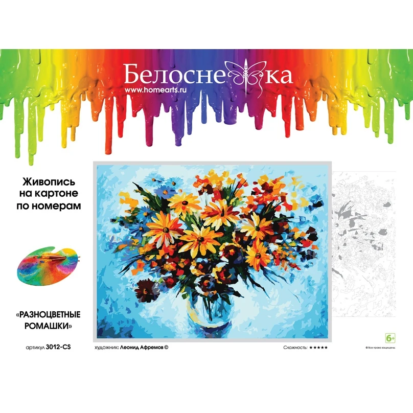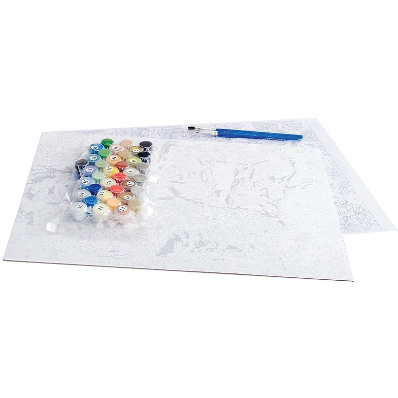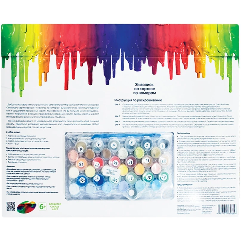 Набор для живописи по номерам на картоне.В наборе: основа для картины из толстого картона с нанесенными контурами участков для раскрашивания (толщина картона 2 мм), акриловые краски, контрольный лист с контурами рисунка, 3 кисти.Набор упакован в конверт из плотного картона, на обратной стороне упаковки блистер с красками. Дополнительную защиту набору обеспечивает лавсановая пленка.Размер: 30x40 см.