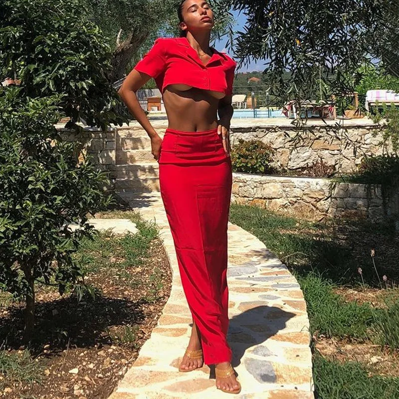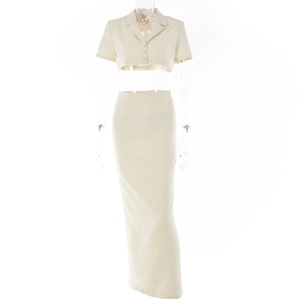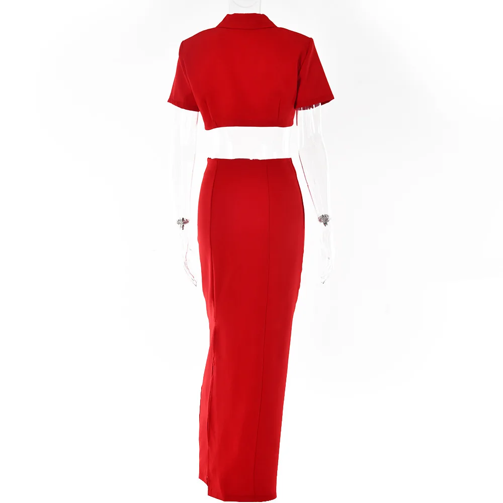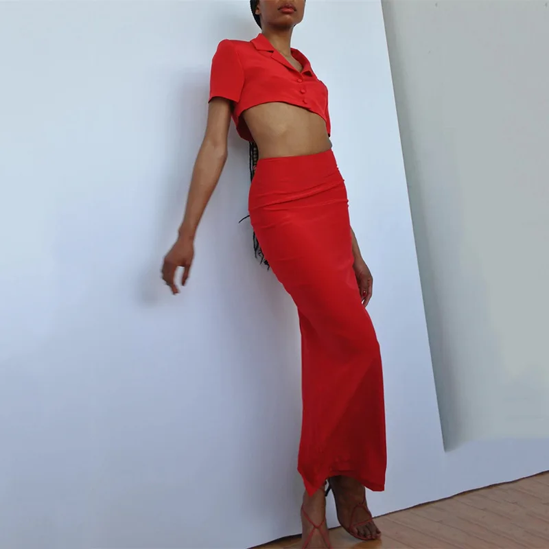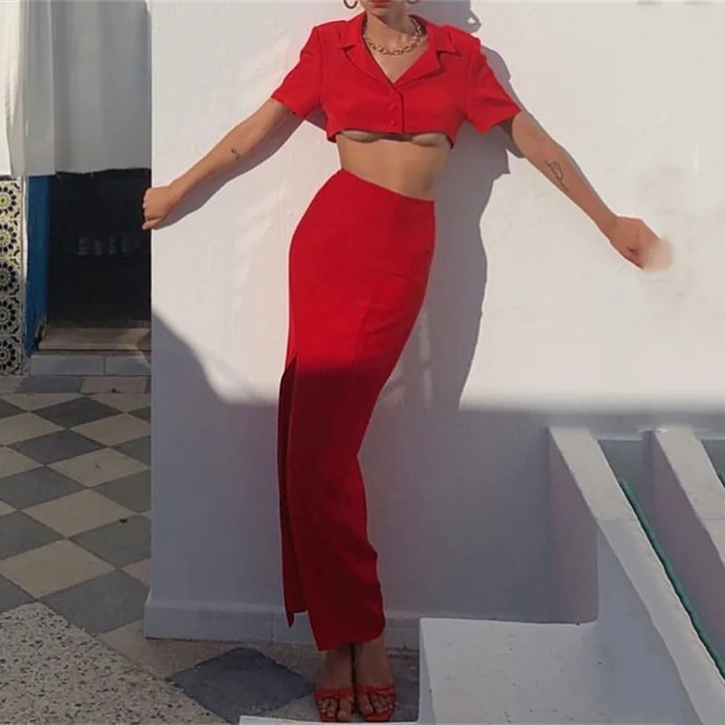 Женский комплект из двух предметов, короткий топ с коротким рукавом и пуговицами, облегающая юбка-макси с высокой талией, осенняя Сексуальная Праздничная Клубная одежда, комплекты одежды