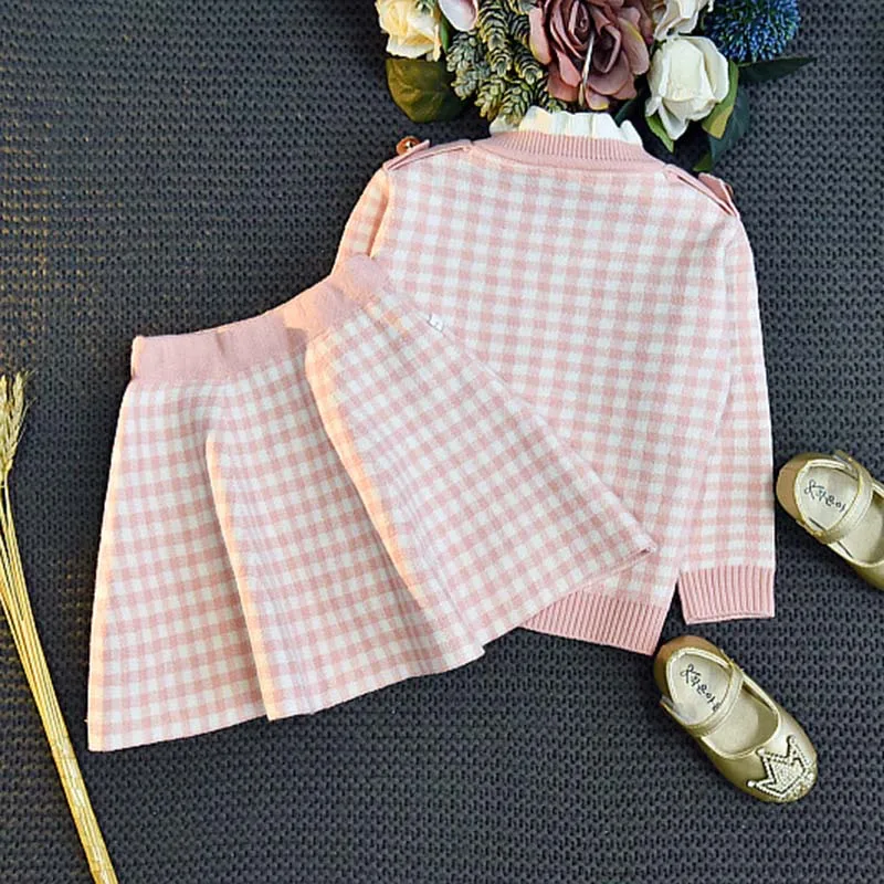Вязаная клетчатая куртка для девочек + юбка с воротником-стойкой, костюм из двух предметов, зимняя одежда для маленьких девочек, свитер для малышей, свитер для маленьких девочек