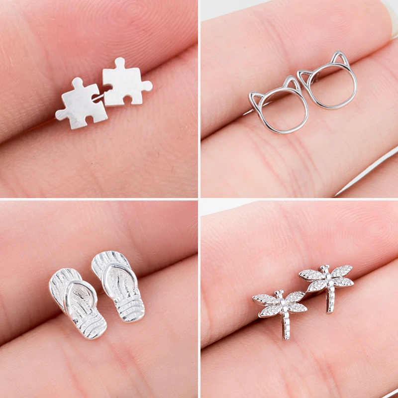 Минималистичные ювелирные изделия, серебряные серьги-пазлы для женщин, милые маленькие кошки, стрекозы, уникальные заклепки в виде тапочек, детские подарки