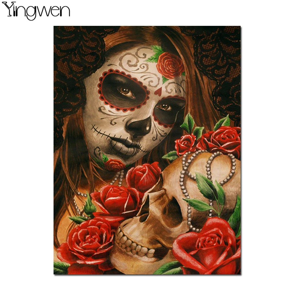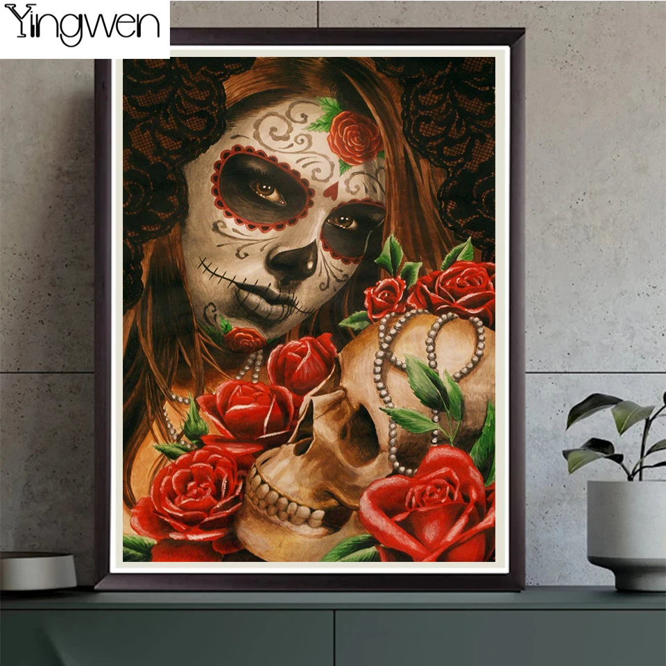 Алмазная 5D картина сделай сам с изображением девушки, черепа, розы, полная Алмазная вышивка, мозаика, искусство, Хэллоуин, украшение для дома, ручная работа, вышивка крестиком, подарок
