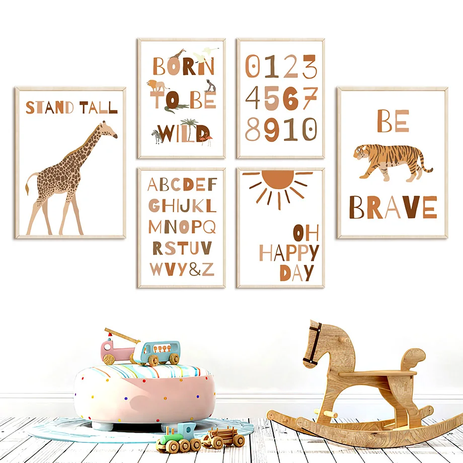 Лев, жираф, слон цифры алфавит в скандинавском стиле плакаты и прин...