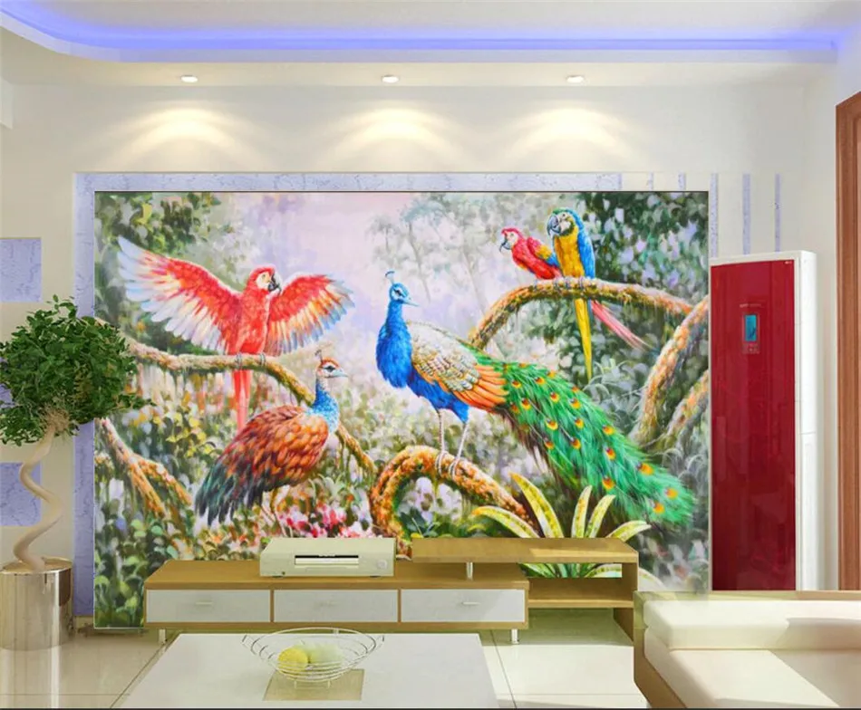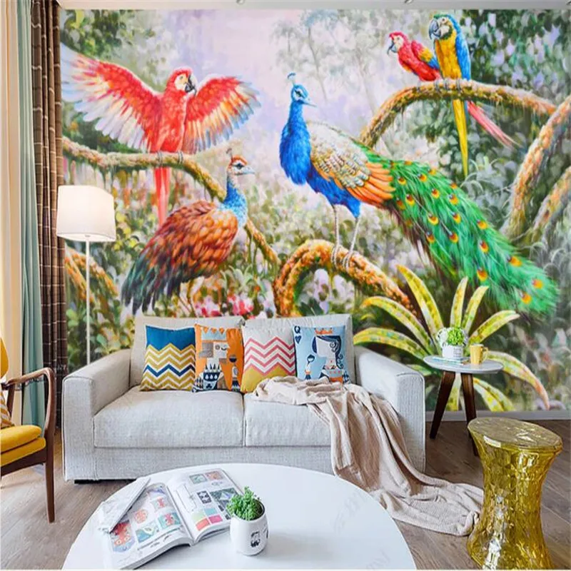 Настенные 3D-обои ручной росписи маслом по индивидуальному размеру, рисунок леса, павлина, попугая, домашний декор