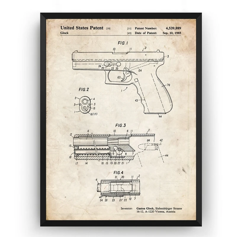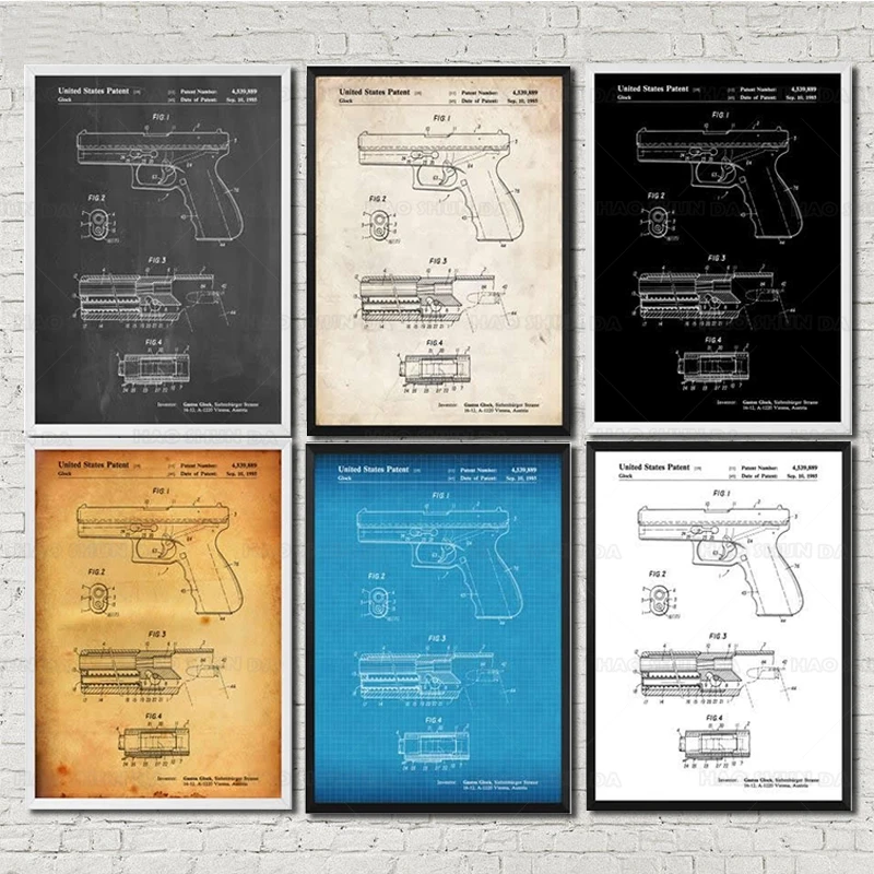 Винтажный Glock 1985, патентный пистолет, настенный военный каркас, постер, холст, картина, hd печать, Настенный декор для homd, художественное оформление