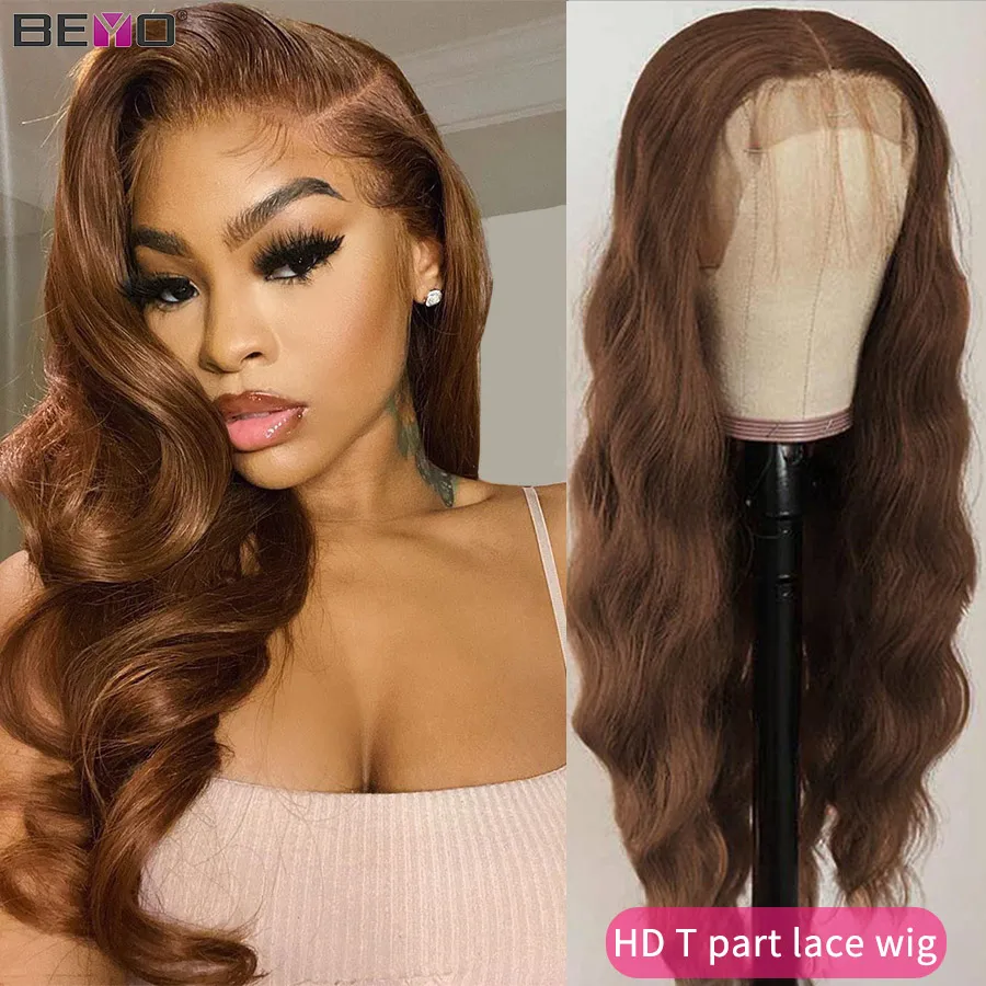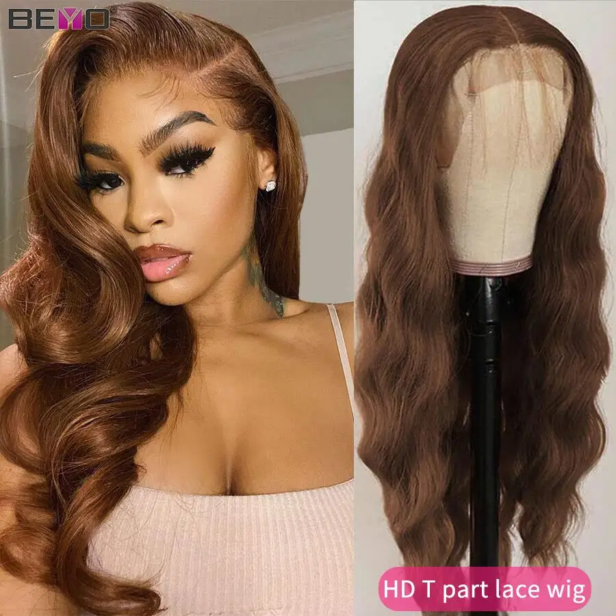 Дешевый парик с коричневыми волнистыми волосами плотности 180, перуанские волосы для черных женщин, T-образные прозрачные парики на сетке Beyo