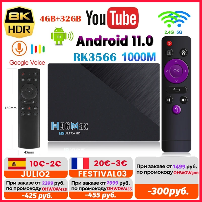 Приставка Смарт-ТВ H96 MAX RK3566, 4 + 32 ГБ, 1080p, 8K, 24 кс
