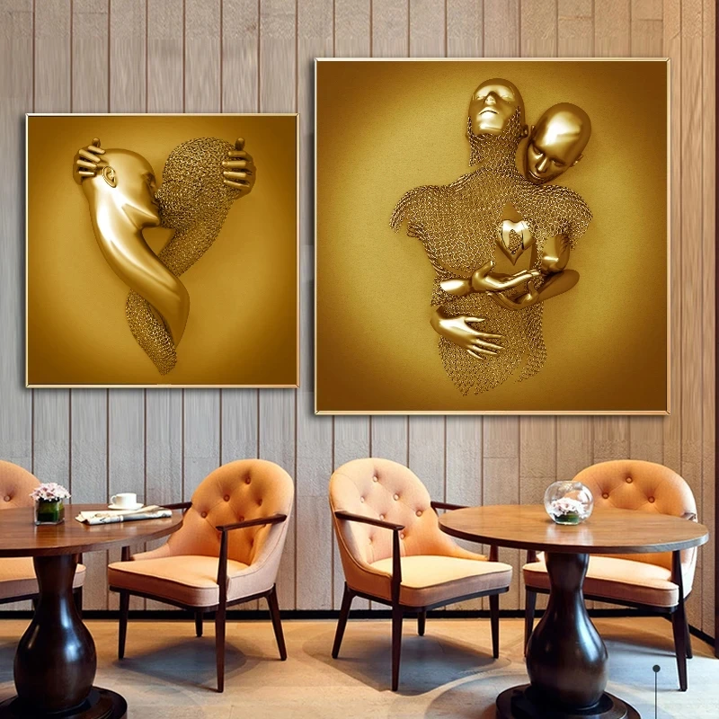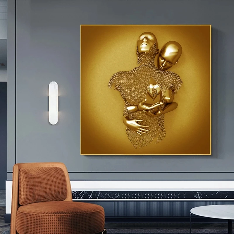 Золотая металлическая фигурка, статуя, абстрактный плакат, Скандинавская скульптура для влюбленных, печатная Настенная картина, постеры и принты для домашнего декора