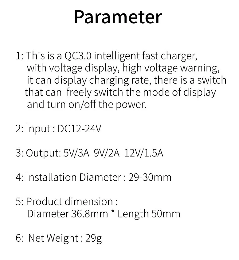 1: Это умная Быстрая зарядка qc3.0 с дисплеем напряжения, предупреждение о высоком напряжении, скорость зарядки может отображаться, есть переключатель, который может свободно переключать режим отображения и включать/выключать питание.