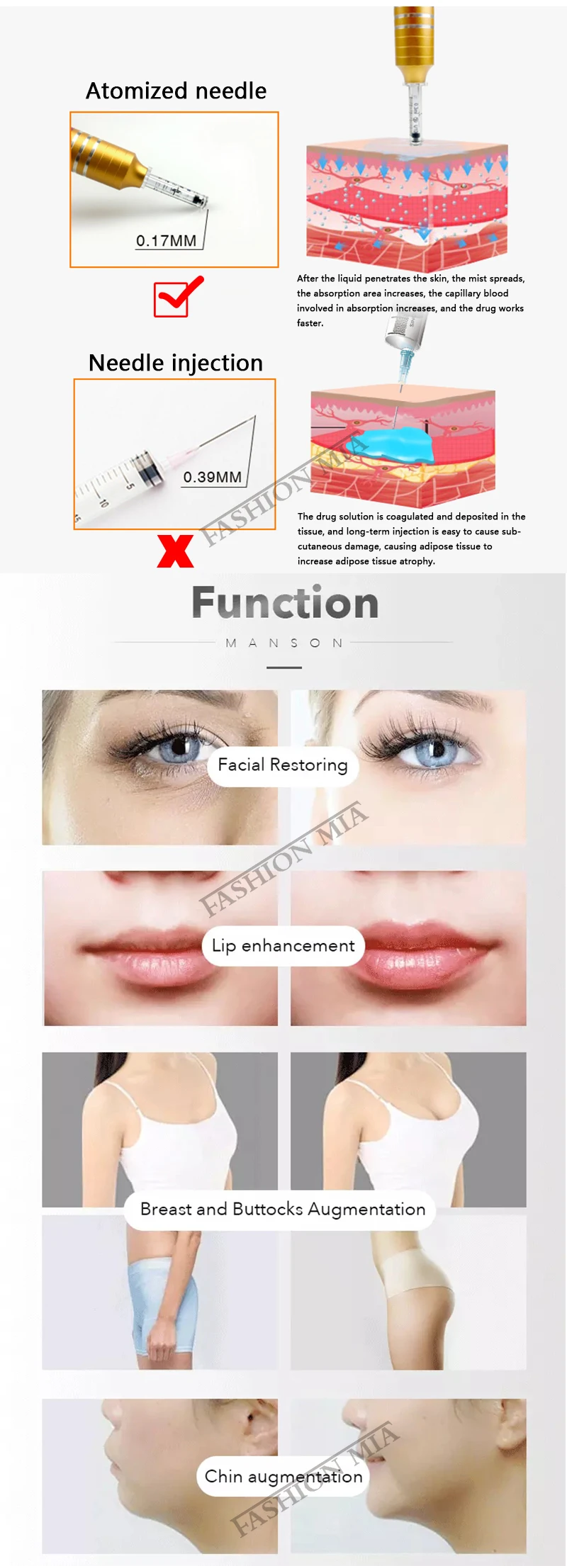Что такое ручка гиалурона?Водная мезотерапия заключается в впрыскивании гиалуроновой кислоты в кожу. Гиалуроновая кислота содержит влагу, в 200-300 раз более богатая, чем тело. Благодаря чему кожа становится гладкой, мягкой, яркой и увлажненной после инъекций. Для того, чтобы сохранить кожу увлажненной, дамы всегда выбирают различные продукты по уходу за кожей. На самом деле, продукты по уходу за кожей только увлажняют влагу на cutin. Так что при размазывании эти продукты не могут глубоко обеспечить влагу для кожи. Как мы знаем, акне, морщинки и неэластичность появятся, если кожа не будет влагой. Водная мезотерапия решает все проблемы из-за отсутствия влаги, таких как шеллоидная кожа, цветовое пятно, морщинки... И он обеспечит влагу для дермы. Поэтому водная мезотерапия хорошо работает на отбеливании, увлажнении и обновлении неэластичности. Характеристики:Название продукта: ручка для инъекций гиалуронаМатериал: нержавеющая сталь 304Особенности: морщинки, подтяжки лица, подтяжки кожи и т. Д. Особенности:-Помогает уменьшить пятна, морщины и следы. Функция подтягивания и наполнения-Увеличение уровня коллагена для создания новой и молодой кожи, что обеспечивает омоложение кожи.-Улучшает кожу, восстанавливает эластичность кожи, улучшает старение.-Может сделать Антивозрастные продукты попадают в глубину кожи, не повреждая кожу, без побочного эффекта, безопасно для использования.-Глубокое Пополнение и богатое питание, укрепляет кожу, чтобы впитать продукт красоты.-Он используется для более чем 10000 инъекций, и Он управляется самоприводной пружиной.-Быстрая инъекция менее 1/3 секунды, микро отверстие и автоматическое пружинное давление делают инъекции безопасными и безболезненными-Удалите меланин в теле, улучшите темную и желтую кожу, сделайте кожу яркой и белой.Водная мезотерапия заключается в впрыскивании гиалуроновой кислоты в кожу. Гиалуроновая кислота содержит влагу, в 200-300 раз более богатая, чем тело. Благодаря чему кожа становится гладкой, мягкой, яркой и увлажненной после инъекций. Для того, чтобы сохранить кожу увлажненной, дамы всегда выбирают различные продукты по уходу за кожей. На самом деле, продукты по уходу за кожей только увлажняют влагу на cutin. Так что при размазывании эти продукты не могут глубоко обеспечить влагу для кожи. Как мы знаем, акне, морщинки и неэластичность появятся, если кожа не будет влагой. Водная мезотерапия решает все проблемы из-за отсутствия влаги, таких как шеллоидная кожа, цветовое пятно, морщинки... И он обеспечит влагу для дермы. Поэтому водная мезотерапия хорошо работает на отбеливании, увлажнении и обновлении неэластичности1. Без ИглыМногие люди страдали от игольчатой фобии. Наша технология без игл облегчает игольную фобию без игл.2. Практически без болиБыстрая инъекция менее 1/3 секунды, микро отверстие и автоматическое пружинное давление делают инъекции с «серой» практически безболезненными3. Быстро, легко и безопасноSERATM прост. Он может быть использован пациентами для самостоятельной инъекции, или другие лица могут вводить инъекции назначенного лекарства.4. Нет риска травм от игл-палокОн устраняет повреждения игольчатой палочки, так как Сера не содержит иглы, тем самым снижая затраты на удаление, устраняет перекрестное загрязнение5. Сопло и адаптер стерилизуются гамма-облучением:Они однор