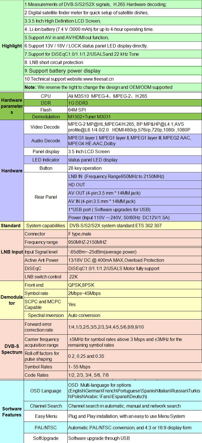 -Измерения сигналов DVB-S/S2/s2x, аппаратного декодирования H.265,-Цифровой спутниковый искатель для быстрой настройки спутниковой антенны,-2,8-дюймовый ЖК-экран высокой четкости,-Литий-ионный аккумулятор (7,4 В/3000 мАч) до 4 часов работы,-Поддержка функции AV in andAV/HDMIout,-Поддержка напрямую светодиодного дисплея панели состояния 13 в/18 В/блокировки,-Поддержка тона DiSEqC1.0/1,1/1,2/песка 22 кГц-Защита от короткого замыкания LNB-Поддержка отображения заряда батареи,Примечание: мы оставляем за собой право изменить дизайн и поддержка OEM/ODM