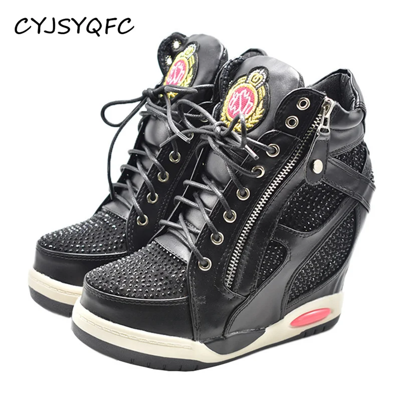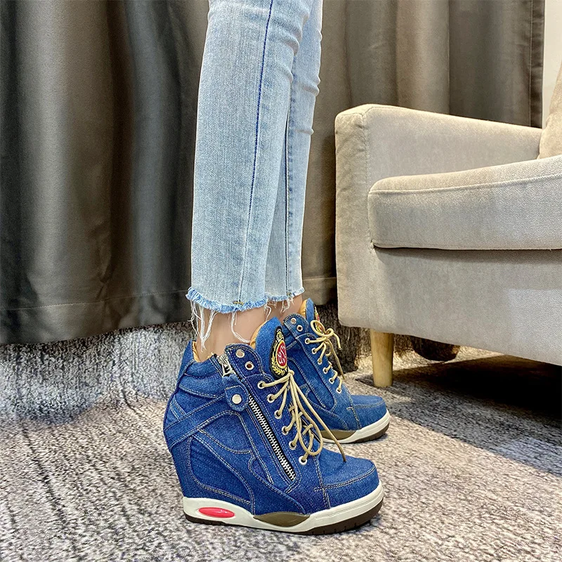 Женские джинсовые кроссовки на танкетке, со шнуровкой и боковой молнией