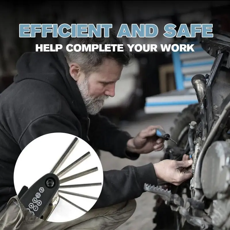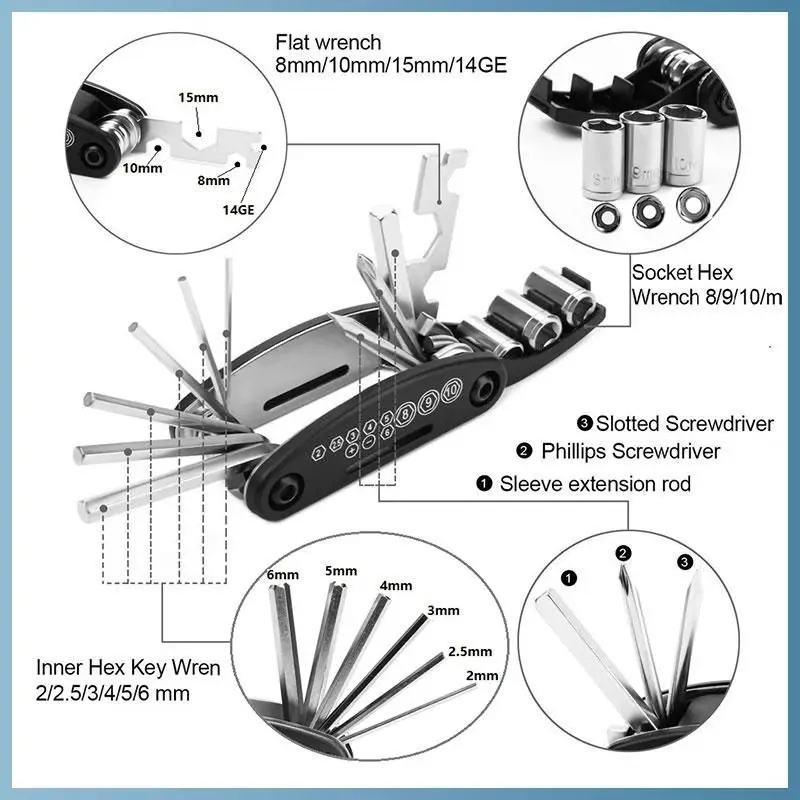 Все в одном многофункциональном инструменте, включая Внутренний шестигранный ключ 2 мм/2,5 мм/3 мм/4 мм/5 мм/6 мм, Отвертка с прорезями и Philips, Удлинитель рукава, спицевый ключ, плоский гаечный ключ 8 мм/10 мм/15 мм, Торцевой ключ 8 мм/9 мм/10 мм.