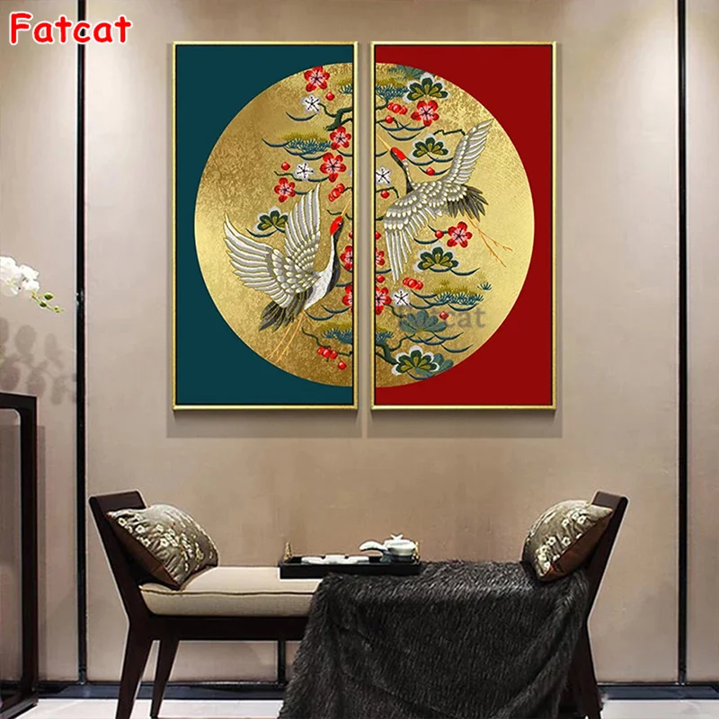 Набор для алмазной вышивки 5D в китайском стиле 2 шт., полноразмерная квадратная круглая картина сделай сам с фламинго, краном, цветком сливы, домашний декор PP2330