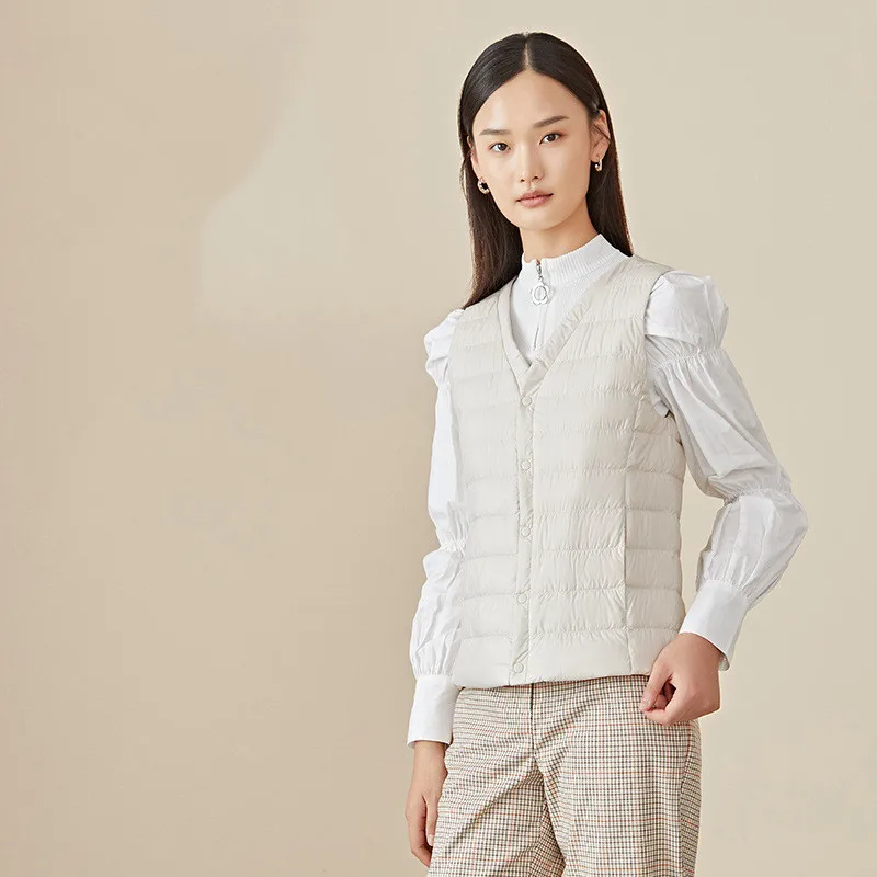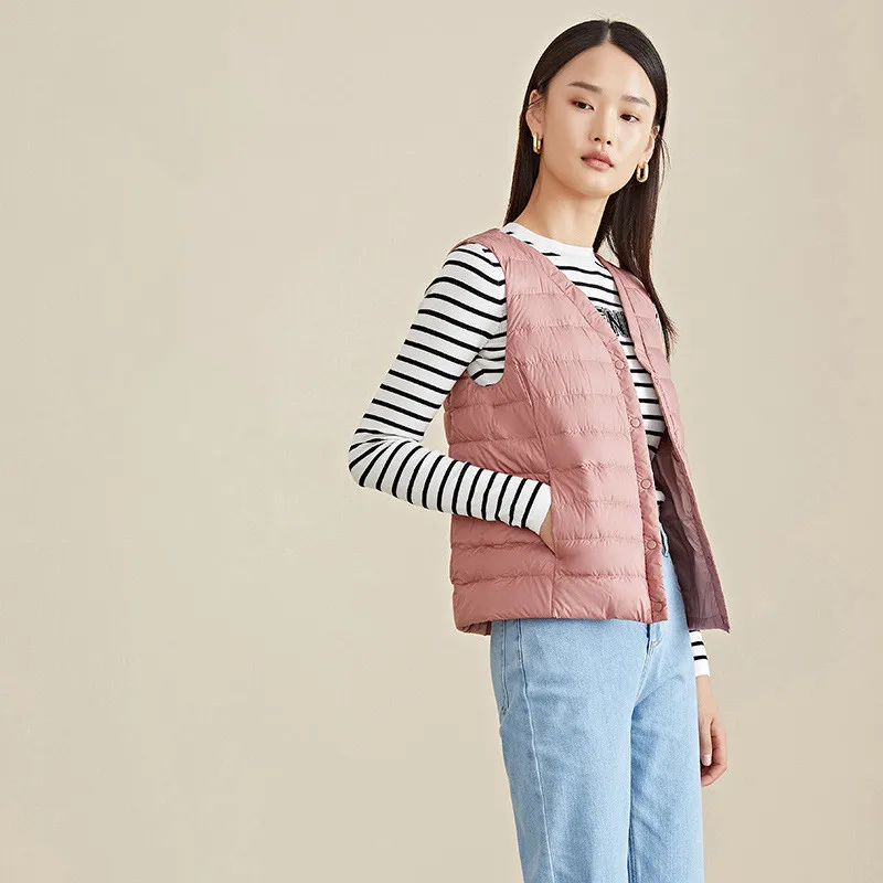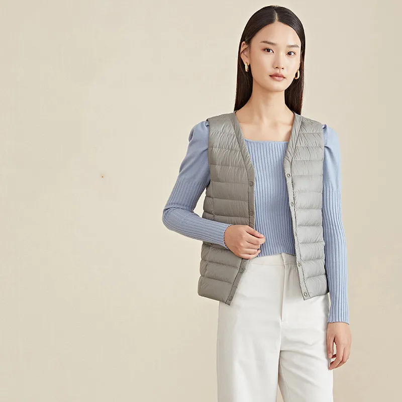 Женский тонкий пуховик с V-образным вырезом, на пуговицах