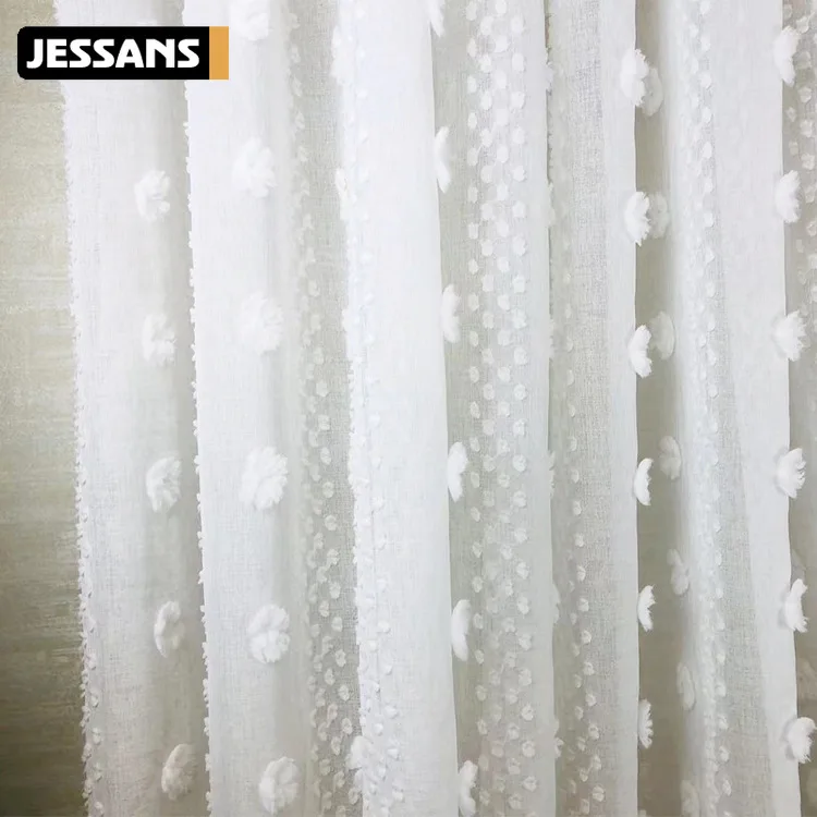 Занавески с белыми помпонами, тюлевые шторы с помпонами для гостино...