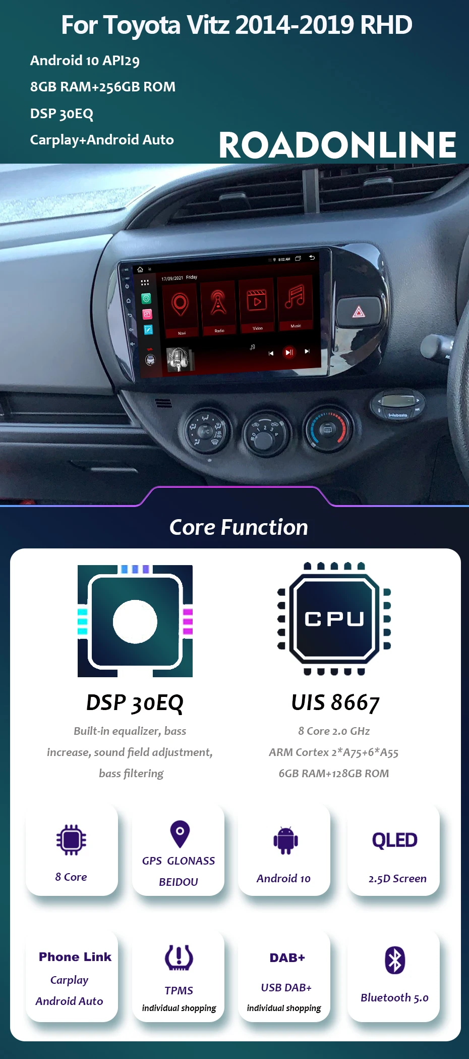 Автомобильный мультимедийный плеер 8 + 256 ГБ, радио, видео для Toyota Vitz 2014-2019 RHD Android 10, навигация GPS, сенсорный экран, Авторадио, аудио