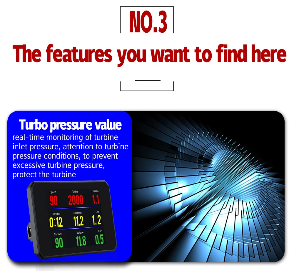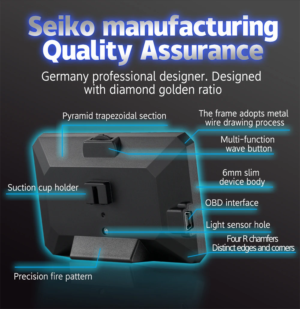 Этот продукт соединяет интерфейс OBD2 с помощью кабеля OBD и отображает данные вождения, например скорость транспортного средства, обороты двигателя, температуру воды, расход топлива, напряжение и т. д. Он может держать глаза водителя всегда на дороге, чтобы избежать опасности опускания головы, чтобы прочитать приборную панель. Этот продукт не изменит данные ECU для автомобиля.