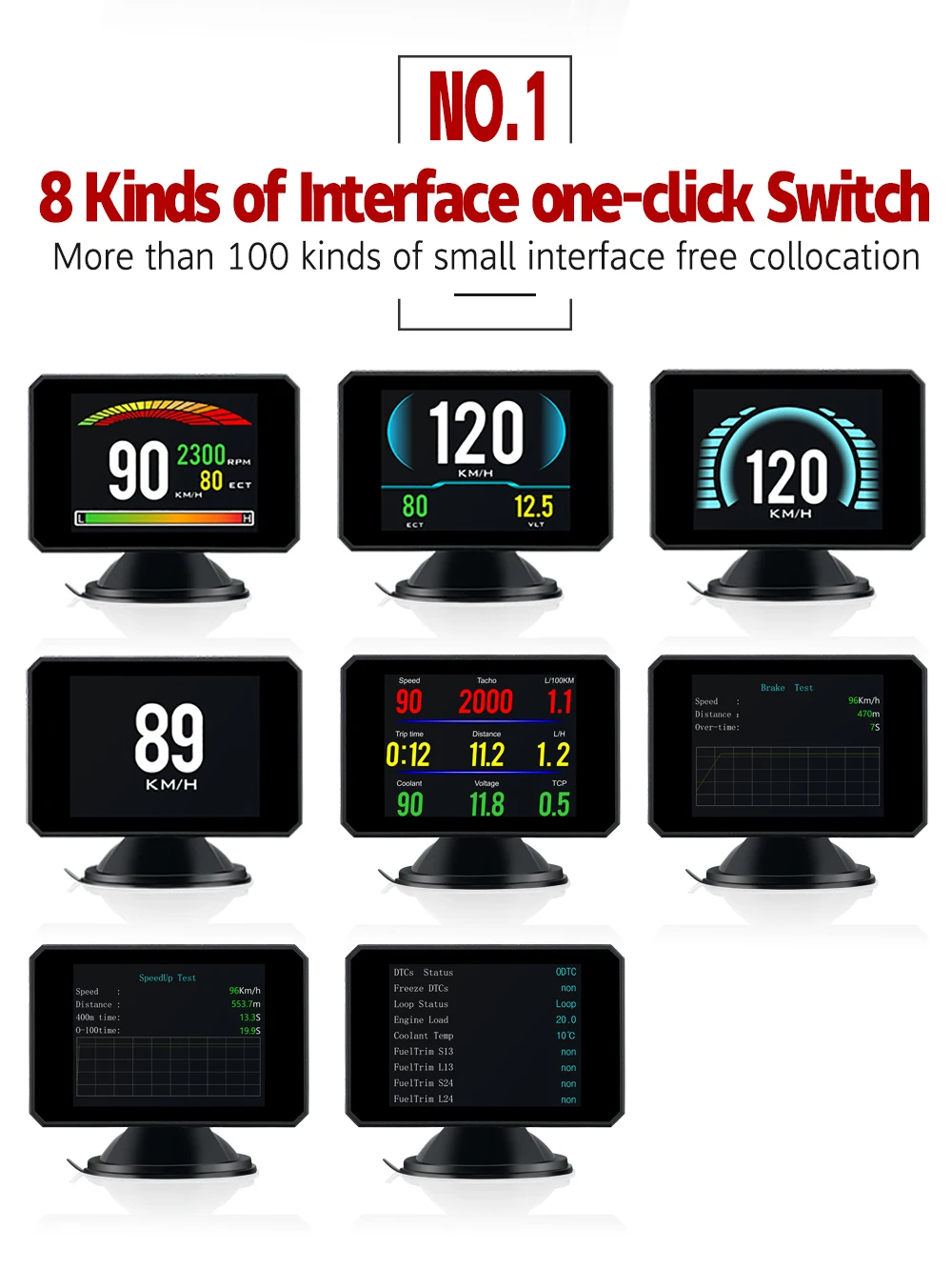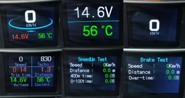 Напряжение, мгновенный расход топлива, средний расход топлива, расстояние вождения, расстояние и время одного вождения, сигнал низкого напряжения, сигнал тревоги высокой температуры воды, сигнал тревоги превышения скорости, код неисправности двигателя, устранение кода неисправности, свободное переключение между километрами и милями.