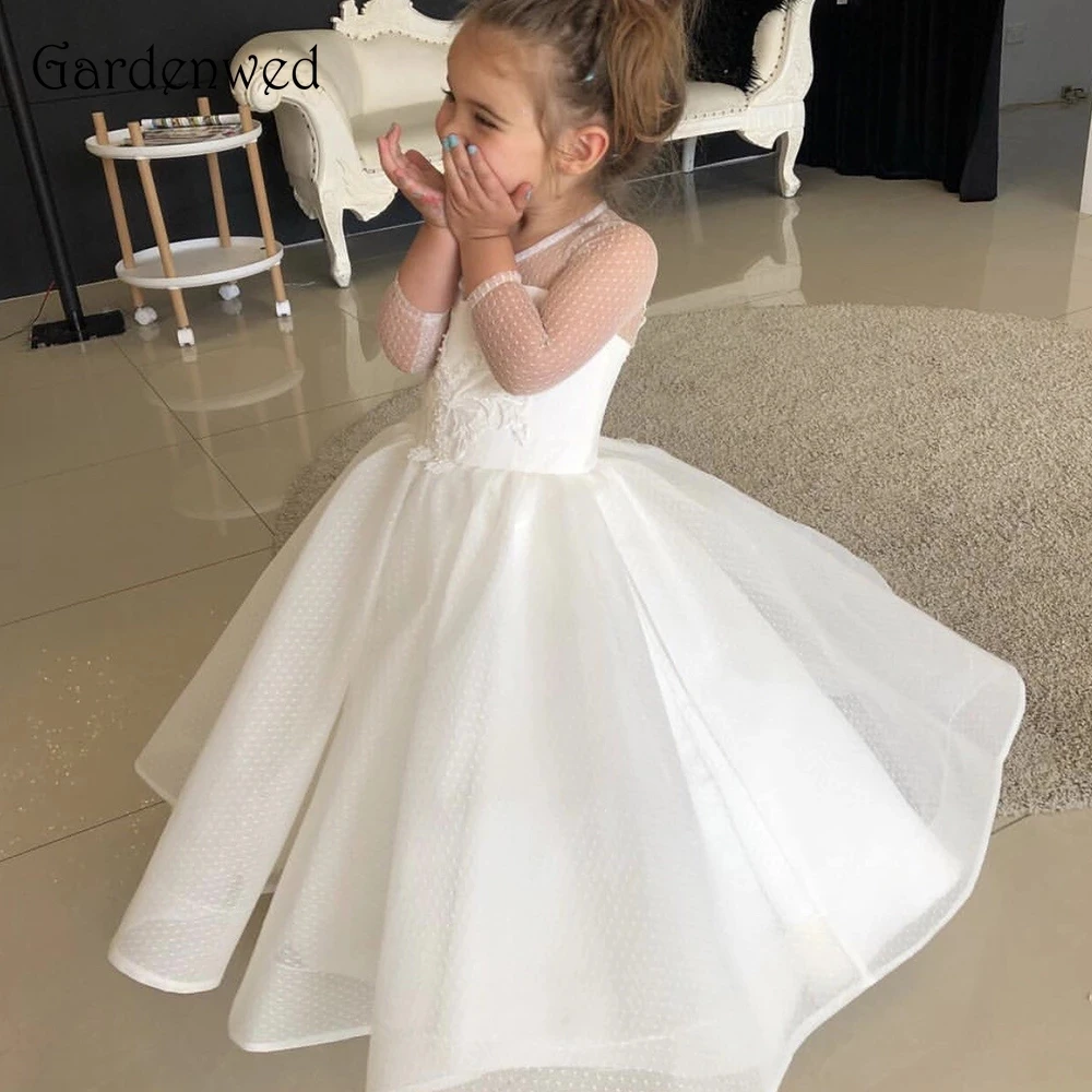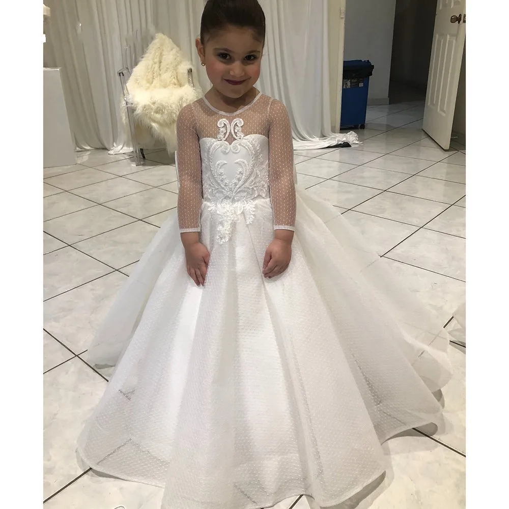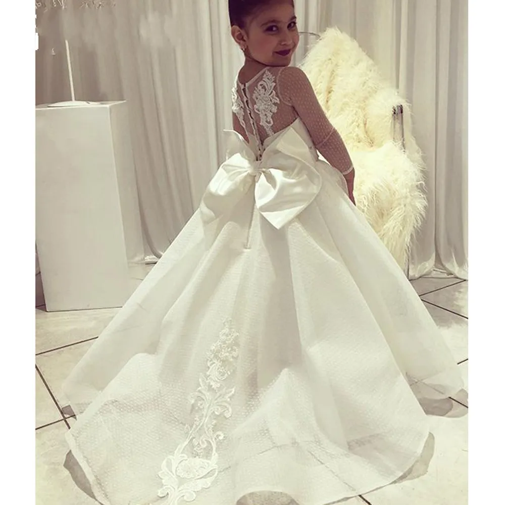 Кружевное платье с цветочным принтом для девочек, белое платье из тюля с аппликацией, праздничные платья для маленьких девочек, Пышное Платье с коротким рукавом на спине для первого причастия