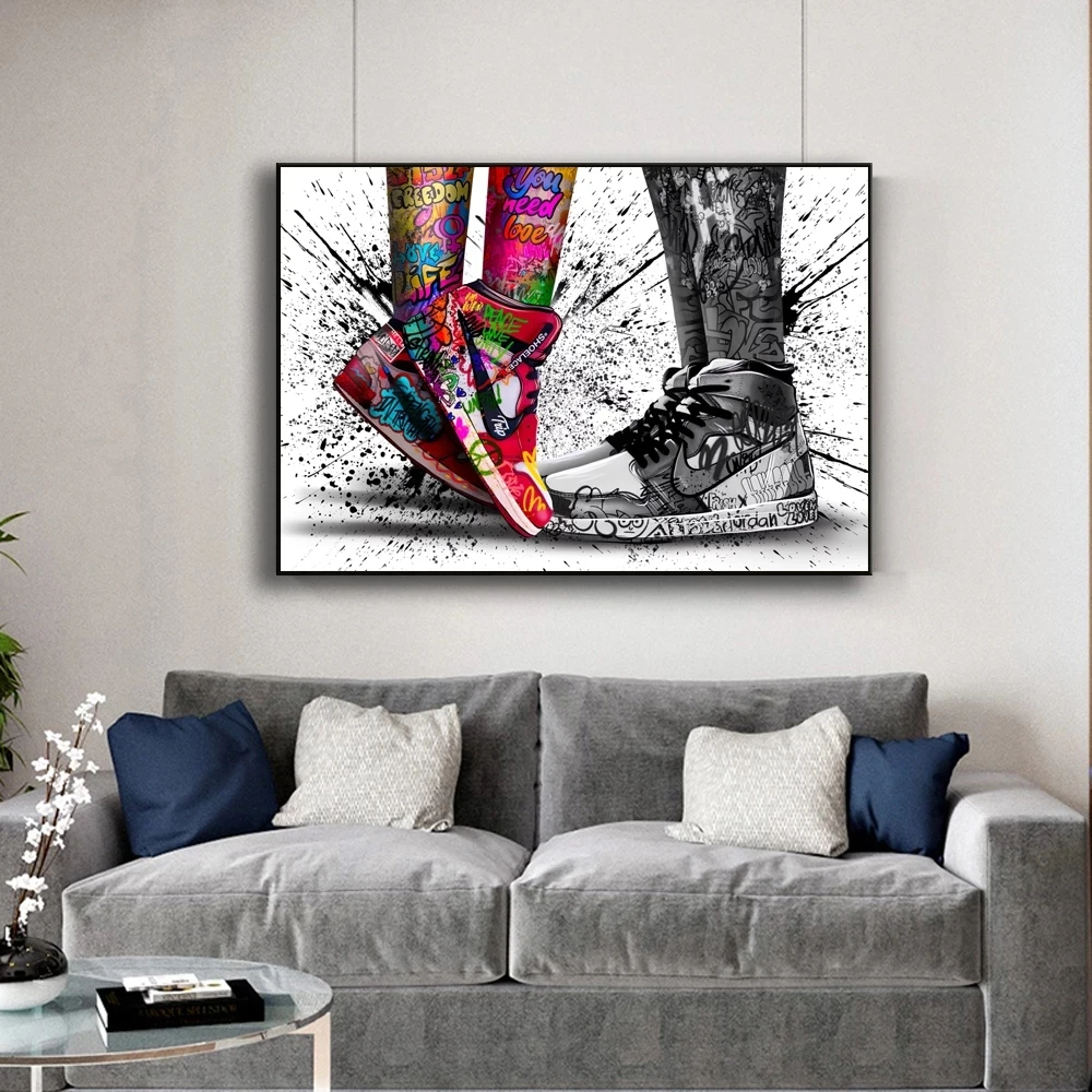 Кроссовки для пары с граффити, настенная роспись, спортивная обувь, печать на холсте, уличное искусство, современная картина для украшения гостиной