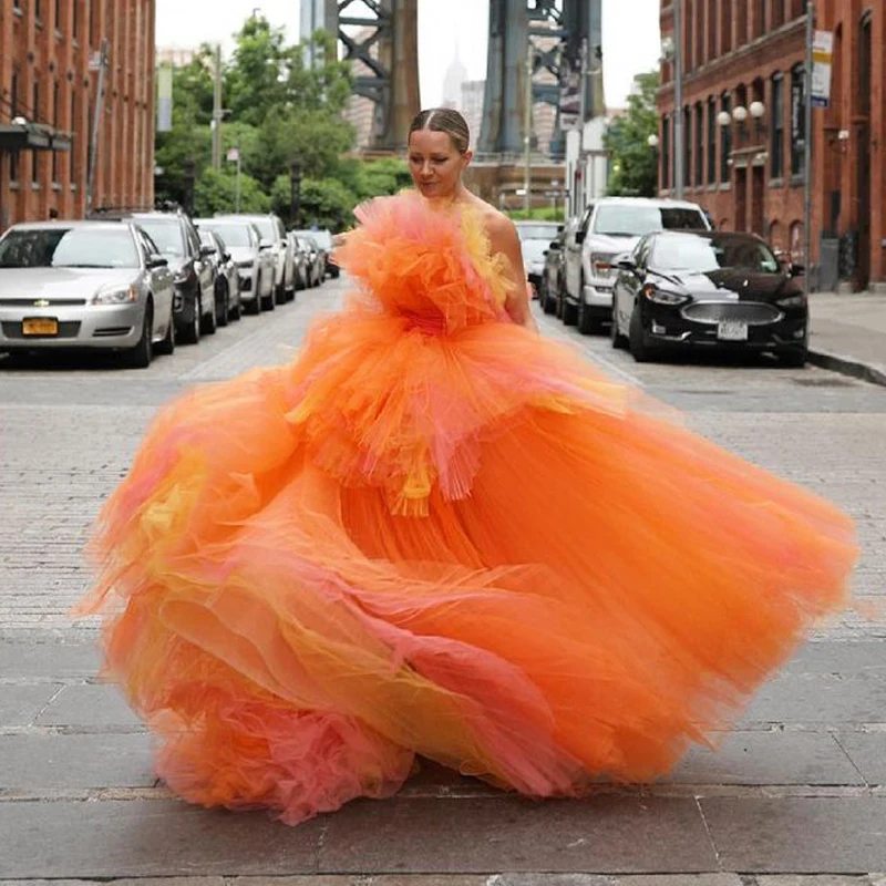 Привлекательные разноцветные тюлевые длинные платья для выпускного вечера бальное платье без бретелек Пышное Платье для фотосессии с оборками оранжевые тюлевые официальные платья для выпускного вечера