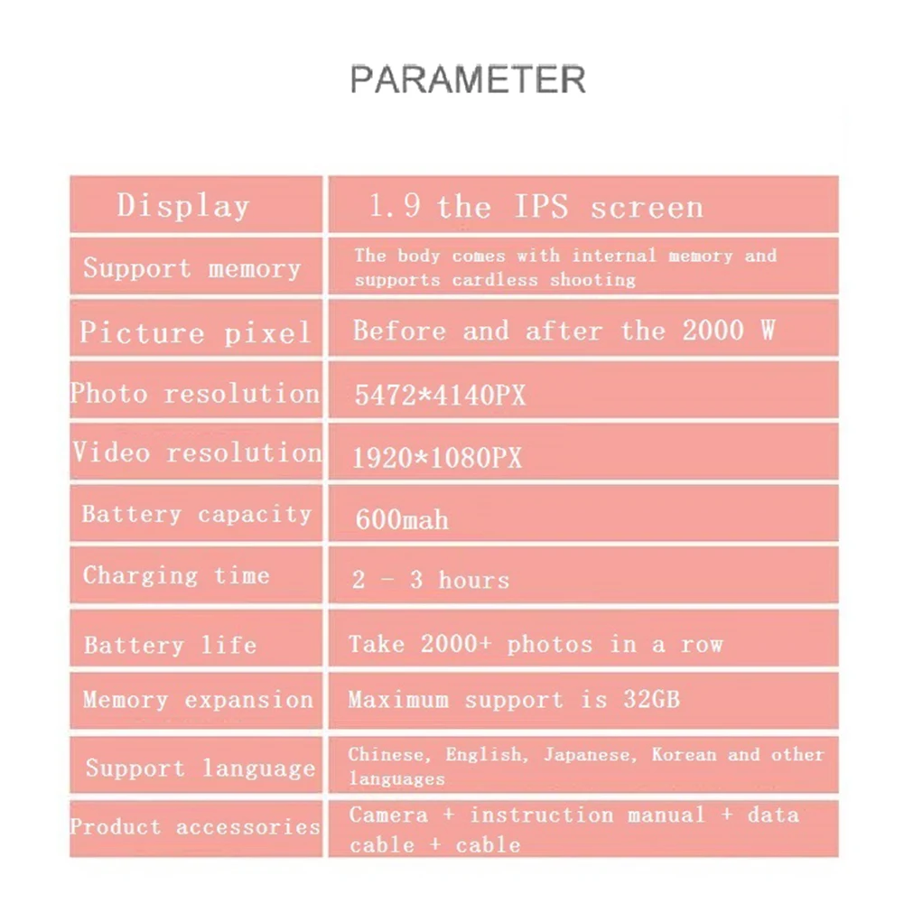 X5S Детская цифровая камера Развивающие игрушки для детей HD 1080P IPS Видеокамера фотография Рождественский подарок на день рожденияХарактеристика:Фотографии, видео, фотографии времени, мини-игры, различные фоторамки, игрушки. Спецификация:Разрешение видео: 1920*1080Разрешение фото: 5472*5104Емкость аккумулятора: 400-600 мАчДисплей: 2,0 дюймов ЖК-дисплей ДисплейПиксель: 2000 ВтВремя зарядки: 2-3 часаМаксимальная поддержка карты памяти: 32 Гб (не входит в комплект)Ток и напряжение зарядки: 5 В/1 АФункции: Режим фото, режим видео, Режим фото камеры, черно-белый фильтр, Ностальгический фильтр, Грустный фильтрПоддержка нескольких языков: китайский, английский, китайский, японский, русский, испанский, французский и более 10 языковЦвет: красный, синийРазмер изделия: 86*59*52 ммВес изделия: 225 гРазмер упаковки: 143*132*54 ммВес посылка: 256 г Примечание:В связи с различиями мониторов и эффектами освещения реальный цвет товара может немного отличаться от цвета на фотографиях. Спасибо!Возможны отклонения в 1-2 см вследствие измерений вручную.