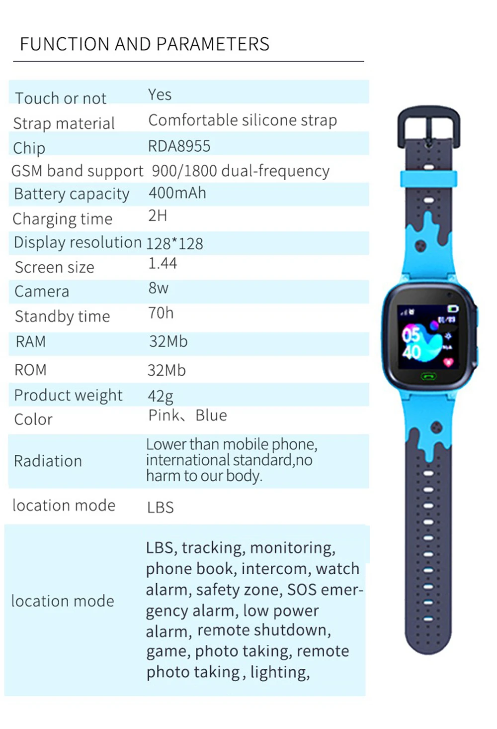 Разрешение дисплея: 128*128Размер экрана: 1,44 дюймаКамера: 8 ВтВремя в режиме ожидания: 3-4 дня (в зависимости от того, как часто вы его используете)Запуск памяти: 32 Мб (большой объем памяти для вашего использования)Память корпуса: 32 МбРазмер часов: 224,8*40,1*15,8 ммВес изделия 42 гЦвет: синий, розовый