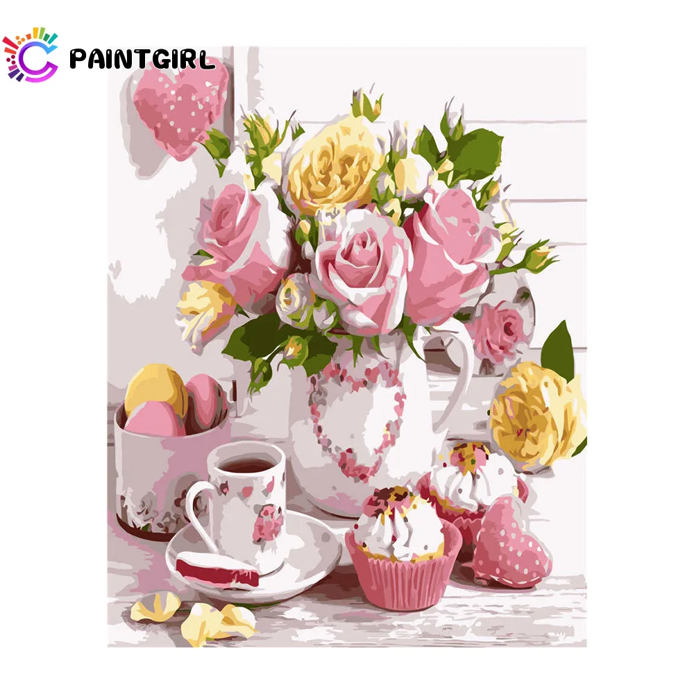 Картины по номерам букет пионовый роз с чаем, Натюрморт цветы в ваз...
