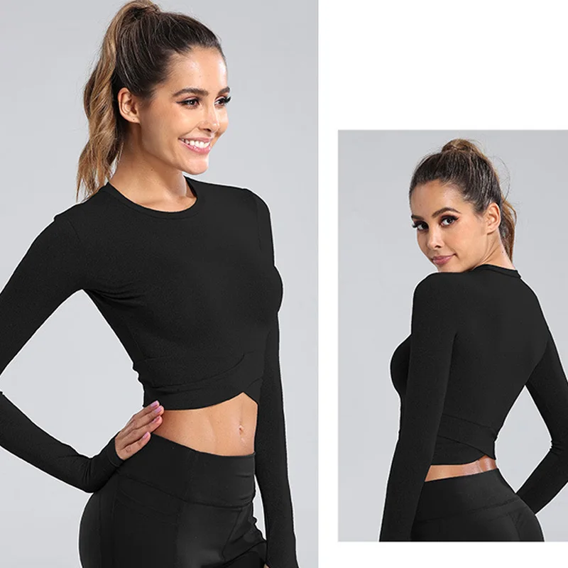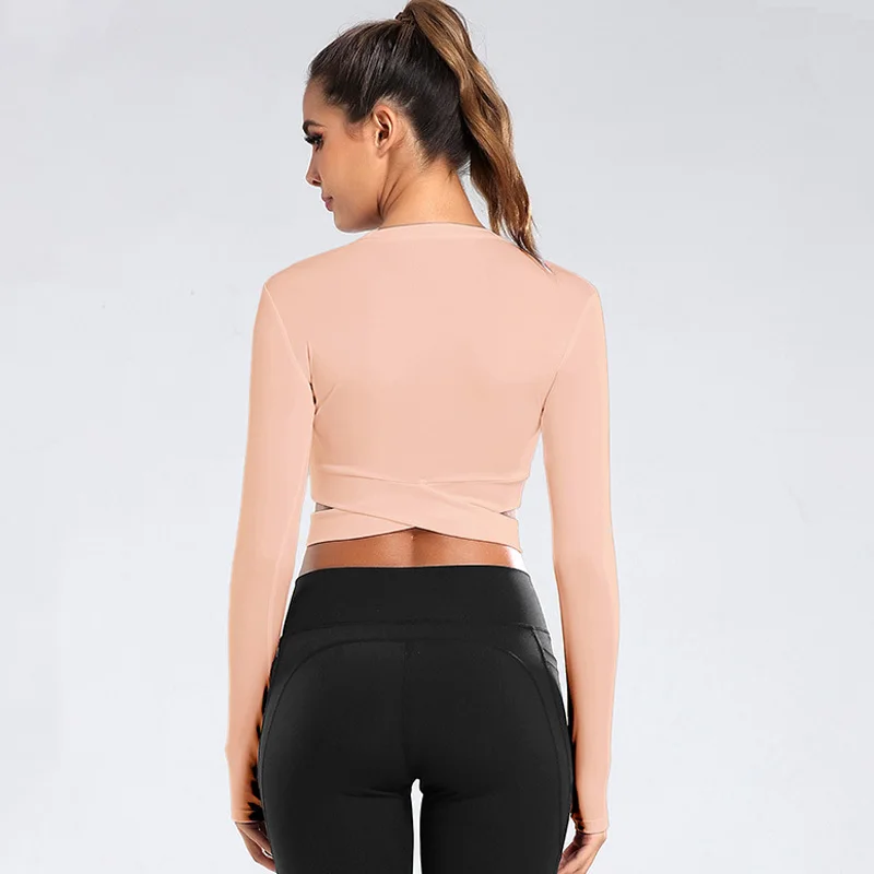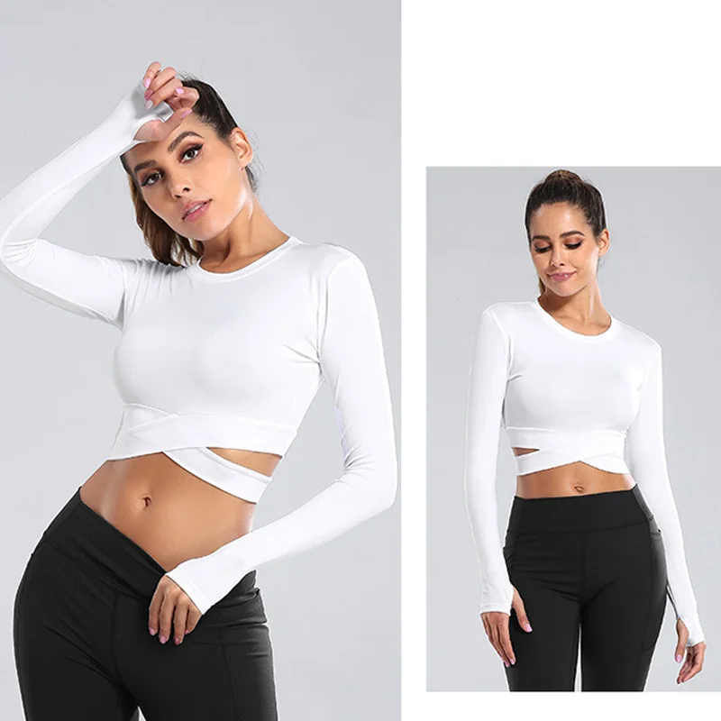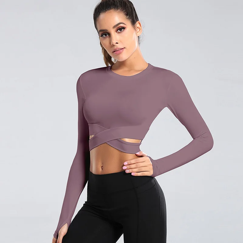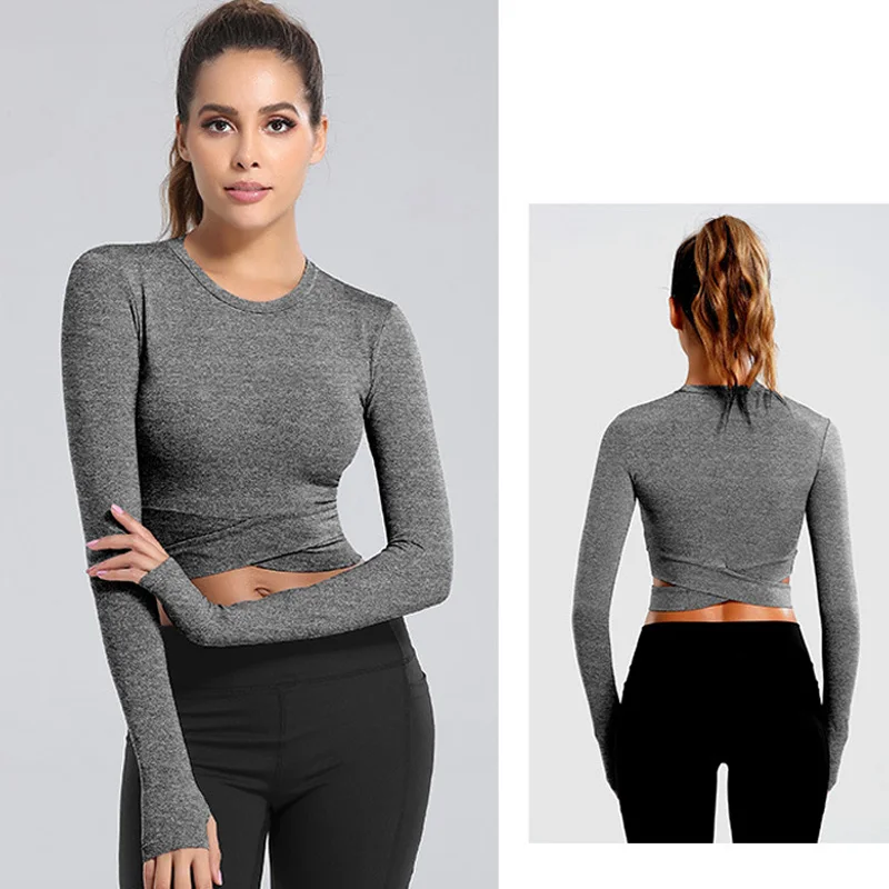 Женские топы с длинным рукавом для фитнеса, короткие быстросохнущие облегающие топы с круглым вырезом и перекрестными ремнями, женские Однотонные эластичные топы для тренировок, женские повседневные топы 7 цветов