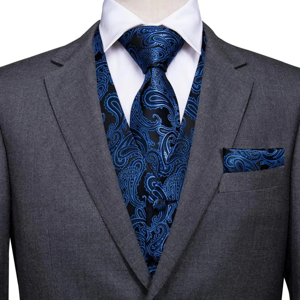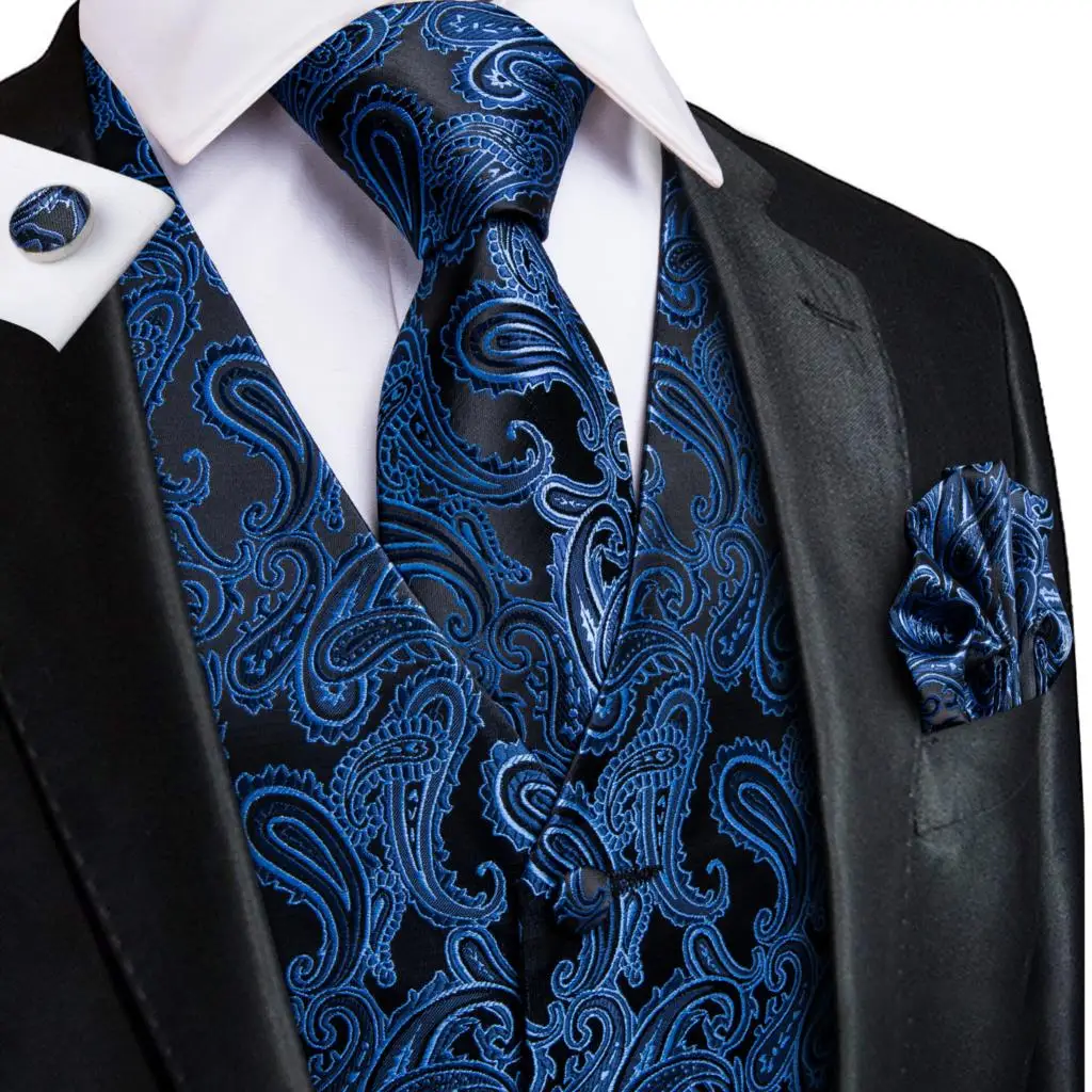 Высококачественный Шелковый мужской облегающий комплект из 4 предметов, жилет, синий, темно-синий, Пейсли, галстук, платок, запонки, костюм, жилет, куртка, набор с галстуком