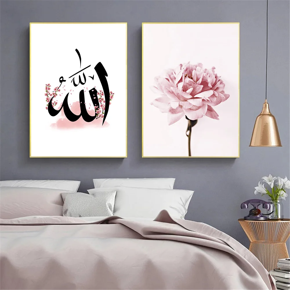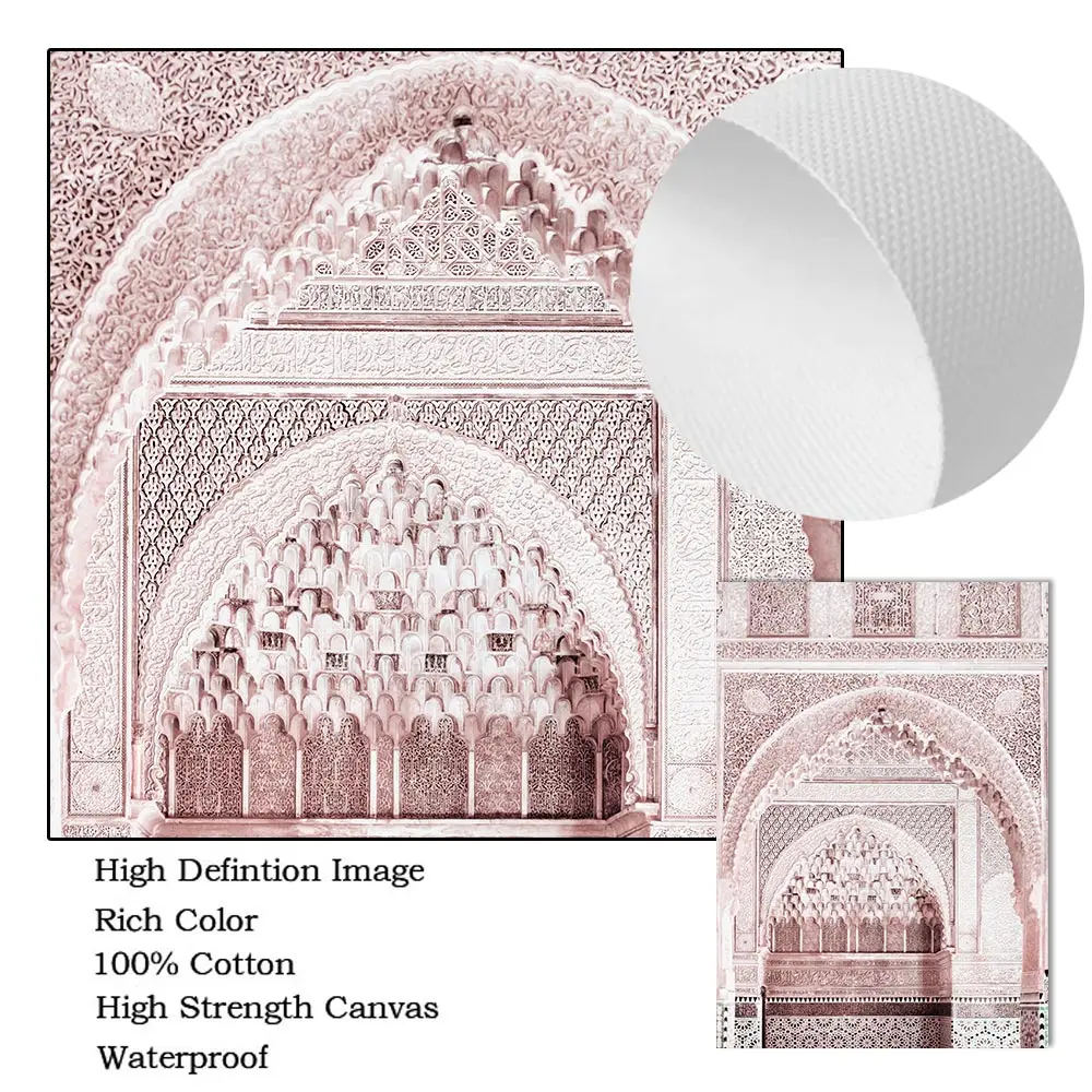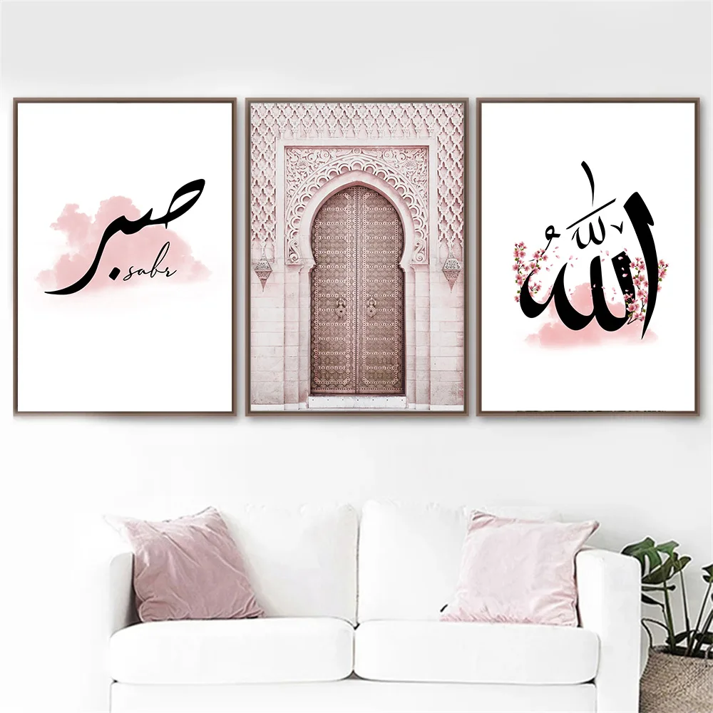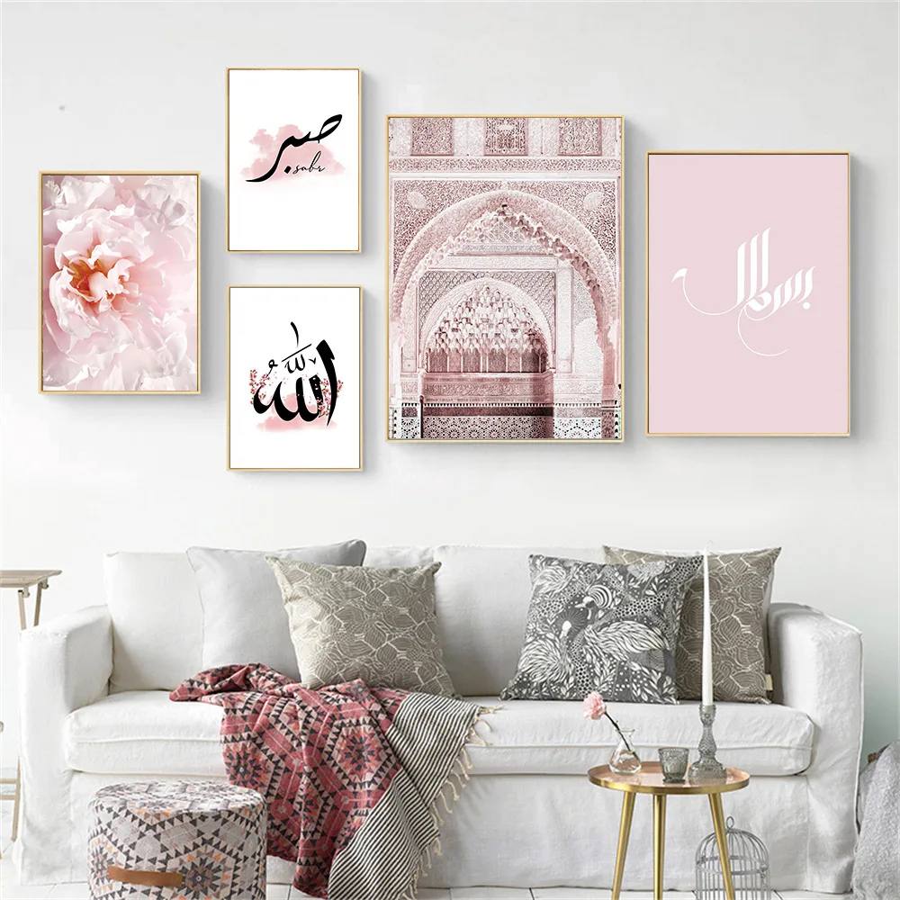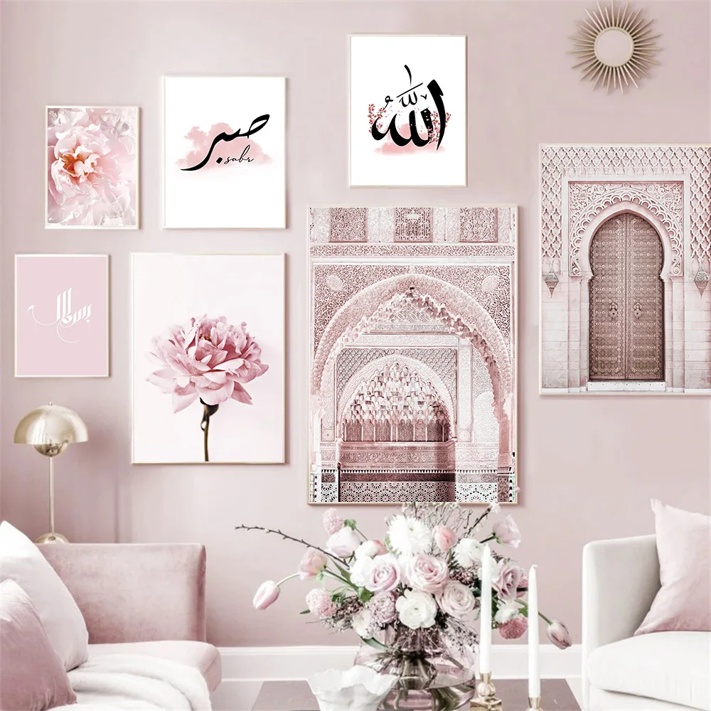 Исламские старые ворота, мечеть, архитектура, настенный постер, Розовый Цветущий Георгин, Mihrab, принты, холст с каллиграфией, живопись, домашний декор