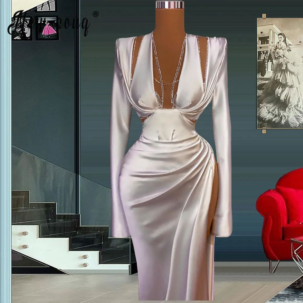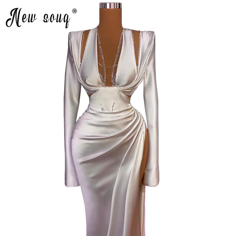 Вечерние платья цвета слоновой кости с длинным рукавом, вечерние платья с разрезом, платья для выпускного вечера с бусинами, платья знаменитостей, размер на заказ