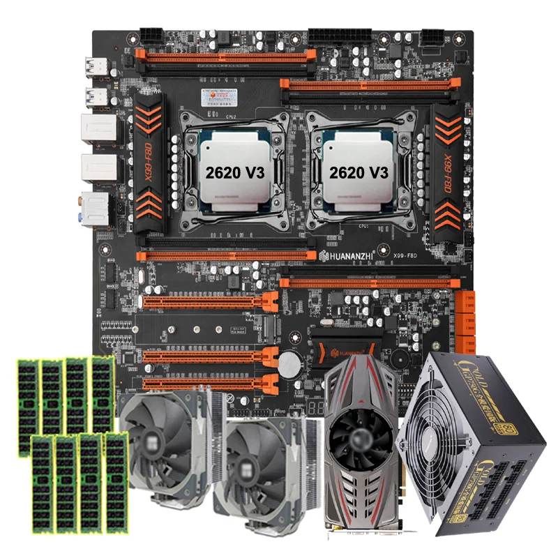 HUANANZHI X99-F8D LGA2011-3 двойная материнская плата CPU + двойной 2620V3 + двойной кулер CPU + 8*8G 2133 REG ECC память + Б/у GTX750TI 2G видеокарта + 80Plus ЗОЛОТОЙ 650W PSU + SATA кабель + металлический задний щит + Руководство пользователя