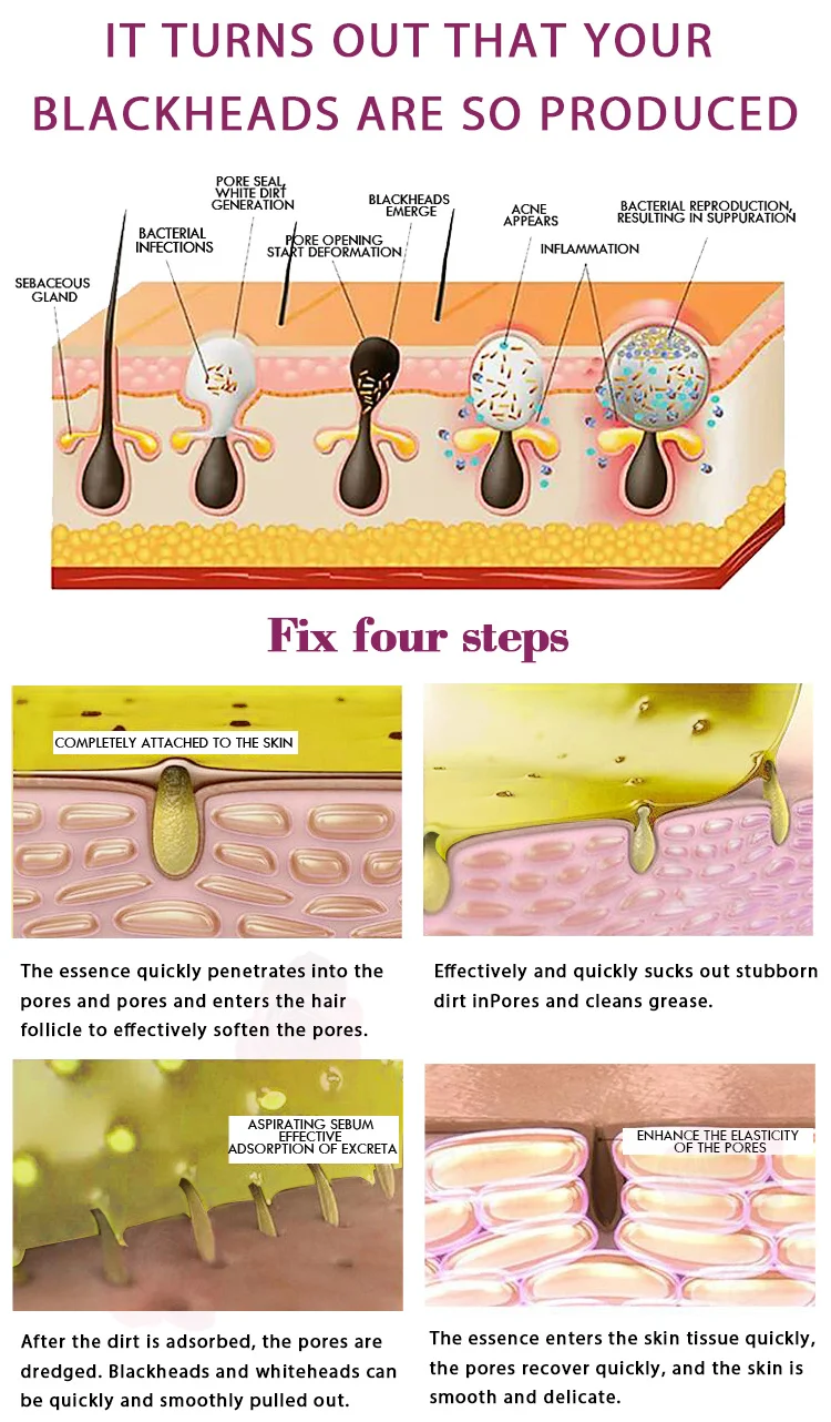 1. Эссенция быстро проникает в поры и попадает в волосяной луковиц грязи для эффективного смягчения пор.2. Эффективно и быстро удаляет стойкую грязь и очищает жир.3. После адсорбирования грязи поры очищаются. Черные и белые точки можно быстро и плавно вытащить.4. Эссенция быстро попадает в кожную ткань, поры быстро восстанавливаются, кожа гладкая и нежная.