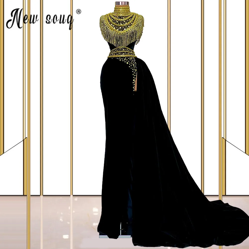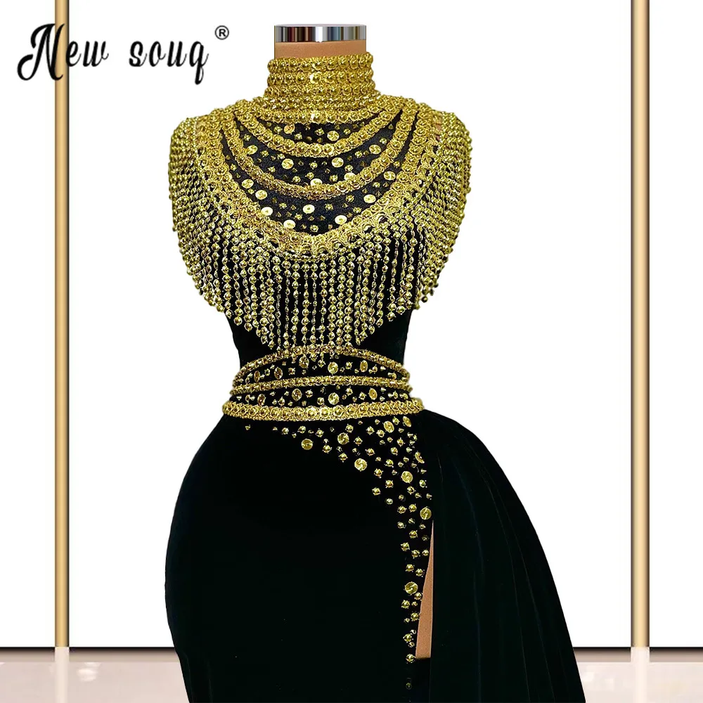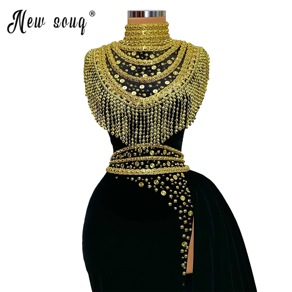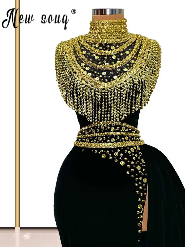 Золотистое вечернее платье с бисером 2021, арабское черное бархатное длинное платье с разрезом для выпускного вечера, бальное платье со шлейфом, последний дизайн