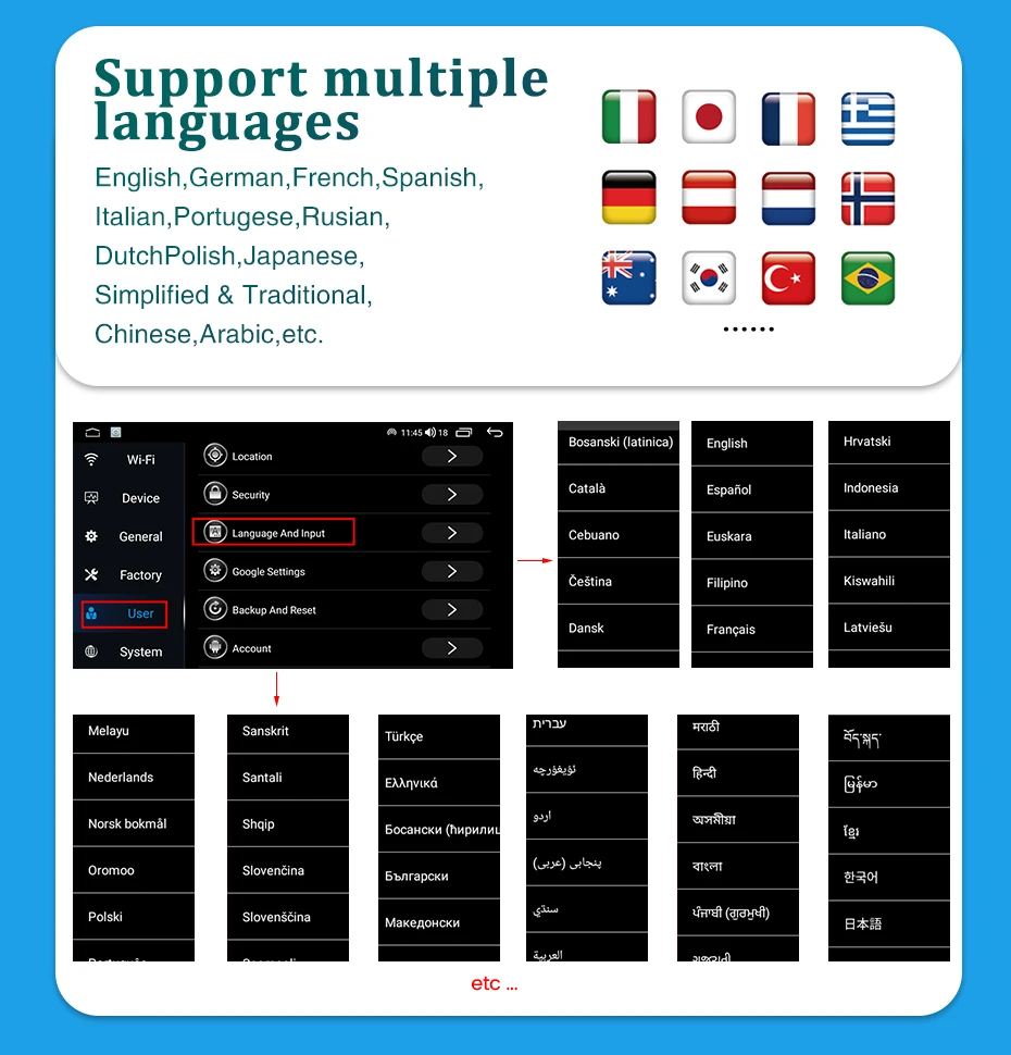 > Поддержка нескольких языков: китайский (упрощенный), русский, испанский, турецкий, русский, иврит, итальянский, китайский (традиционный), арабский, французский, немецкий, английский, португальский, японский и т. Д.