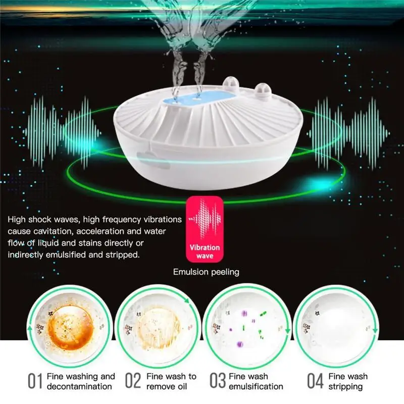 Универсальный: Портативные ультразвуковые стиральные машины могут не только стирать несколько вещей, одежды, полотенец, нижнего белья, носков, футболок, игрушек или других небольших грузов, но и чистить ювелирные изделия, очки, фрукты, овощи и чайные сервизы.