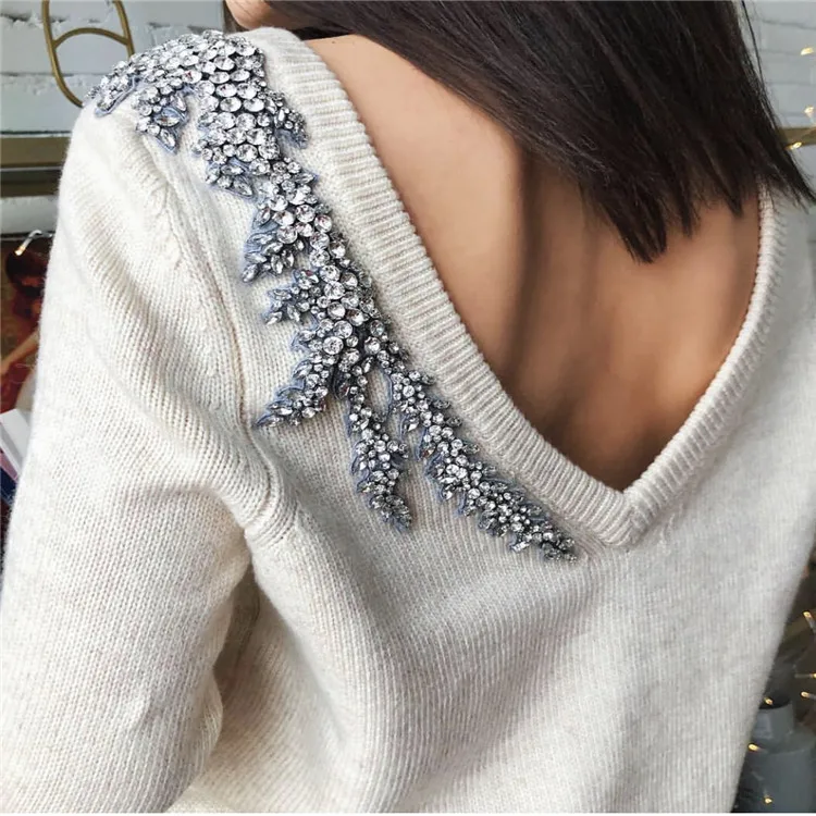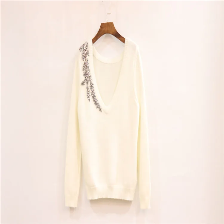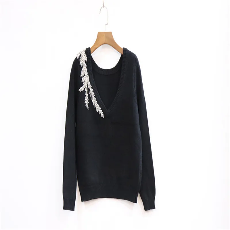 Новинка Осень-зима 2020, вязаная блузка ручной работы с большим V-образным вырезом и бусинами для ногтей