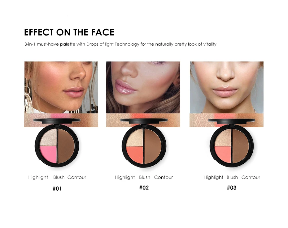 3 цвета в палитре, один мерцающий цвет для подсветки, один матовый бронзирующий порошок для бронзовых щек.
