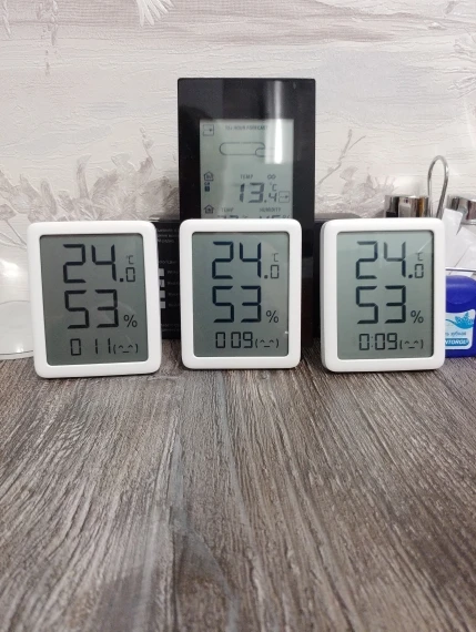 Очень глазастые!(можно сравнить со станцией Еа2 на заднем плане) В комплекте с каждой станцией идет ножка-подставка и крепление со стикером на вертикальную поверхность. Батарейки CR2032 тоже в комплекте. Показания трех приборов через десять минут после включения видны на фото. Датчики откалиброваны идеально! Мой внутренний перфекционист просто ликует ОДНОЗНАЧНО РЕКОМЕНДУЮ К ПОКУПКЕ!!!
