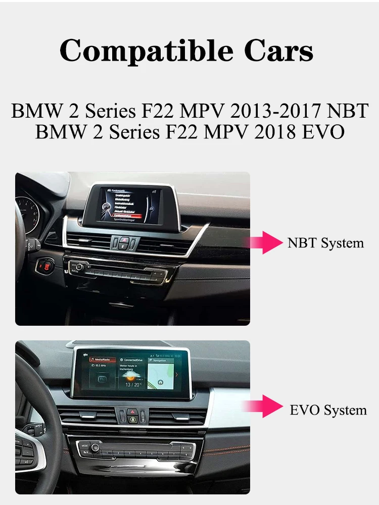 Система EVO BMW 2 серии F22 MPV NBTДля системы EVO, пожалуйста, сообщите нам информацию ниже1. Версия года2. Сенсорный экран или нет3. Автомобиль имеет AUX или нет.