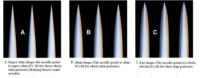 A. Позолоченные иглы: 24-каратное золото поверхность, торжественный внешний вид. B. Спиральная Ручка иглы: игла сделана с использованием традиционного ремесла, напоминающего форму намотанного дракона; Посеребренная поверхность, красивый внешний вид, превосходная технология, отличная традиционная игла. (Доступны как посеребренные, так и позолоченные поверхности). C. Кольцевая игла: игла сделана с использованием традиционного процесса; Поверхности имеют два вида: очистка и серебряное покрытие; Легкий доступ к коже; это наиболее широко используемая традиционная игла. D. Никелированная игла с медной ручкой: продукт популярен в Японии и Южной Корее, с использованием чистой меди, с накатным узором на поверхности, никелированным. E. Вся стальная игла: игла сделана из проволоки из нержавеющей стали с использованием традиционного процесса; Цвет гармоничен с игольчатой костью, красивый и элегантный. F. Плоская игла: игла сделана из чистого алюминия, с накатанной поверхностью, приятная на ощупь рука, красивый и элегантный внешний вид. H. Пассивационная Ручка иглы: Фиолетовый Бронзовый цвет ручки, красивый внешний вид. I. Никелированная Ручка: цветная ручка из нержавеющей стали, не окисленная, красивая и элегантная. J. Пластиковая ручка иглы: размеры разделены в соответствии с цветами ручек, просты в использовании, ручка-светильник, подходит для домашнего ухода.
