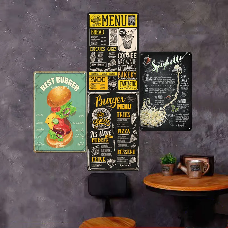 Название: Современная еда, гамбургер, лапша, кофе, пицца, зона, металлическая жестяная вывеска, фрески для кухни, ресторана, кафе, барбекю, железная художественная стена, Декор