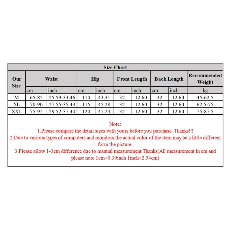 Материал: хлопокДополнительный цвет: черный, белыйРазмер: M/XL/XXL (китайский размер, следуйте таблице размеров, чтобы выбрать, пожалуйста)Размер: M обхват талии: 65-85 см (25,59-33,46 дюйма) обхват бедер: 110 см (43,31 дюйма) длина передней части: 32 см (12,59 дюйма) Длина спины: 32 см (12,59 дюйма) рекомендуемый вес: 45-62,5 кгРазмер: XL обхват талии: 70-90 см (27,55-35,43 дюйма) обхват бедер: 115 см (45,27 дюйма) длина передней части: 32 см (12,59 дюйма) длина задней части: 32 см (12,59 дюйма) рекомендуемый вес: 62,5 кг-75 кгРазмер: XXL обхват талии: 75-95 см (29,52-37,40 дюйма) обхват бедер: 120 см (47,24 дюйма) длина передней части: 32 см (12,59 дюйма) длина задней части: 32 см (12,59 дюйма) рекомендуемый вес: 75-87,5 кгКоличество: 1 шт.