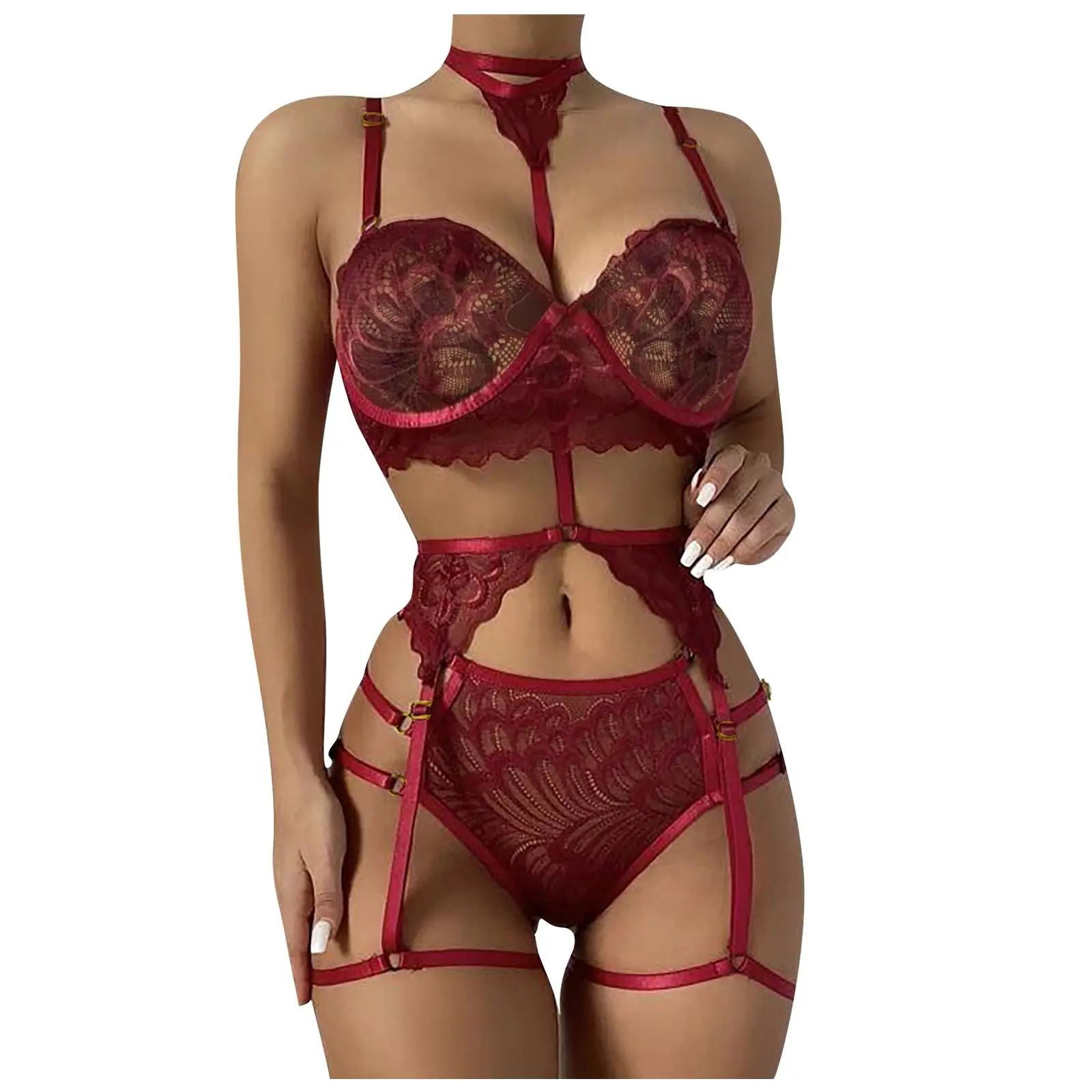 Женский комплект нижнего белья 2022, привлекательный кружевной сетчатый открытый бюстгальтер пуш-ап и трусики, костюм из двух предметов, черное Бандажное нижнее белье