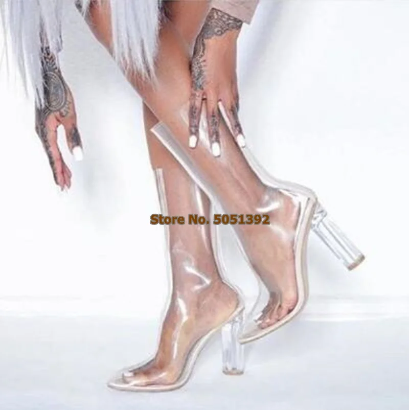 Женские босоножки из прозрачного ПВХ, босоножки на высоком квадратном каблуке с острым носком, пикантные сапоги до середины икры, лодочки для ночного клуба