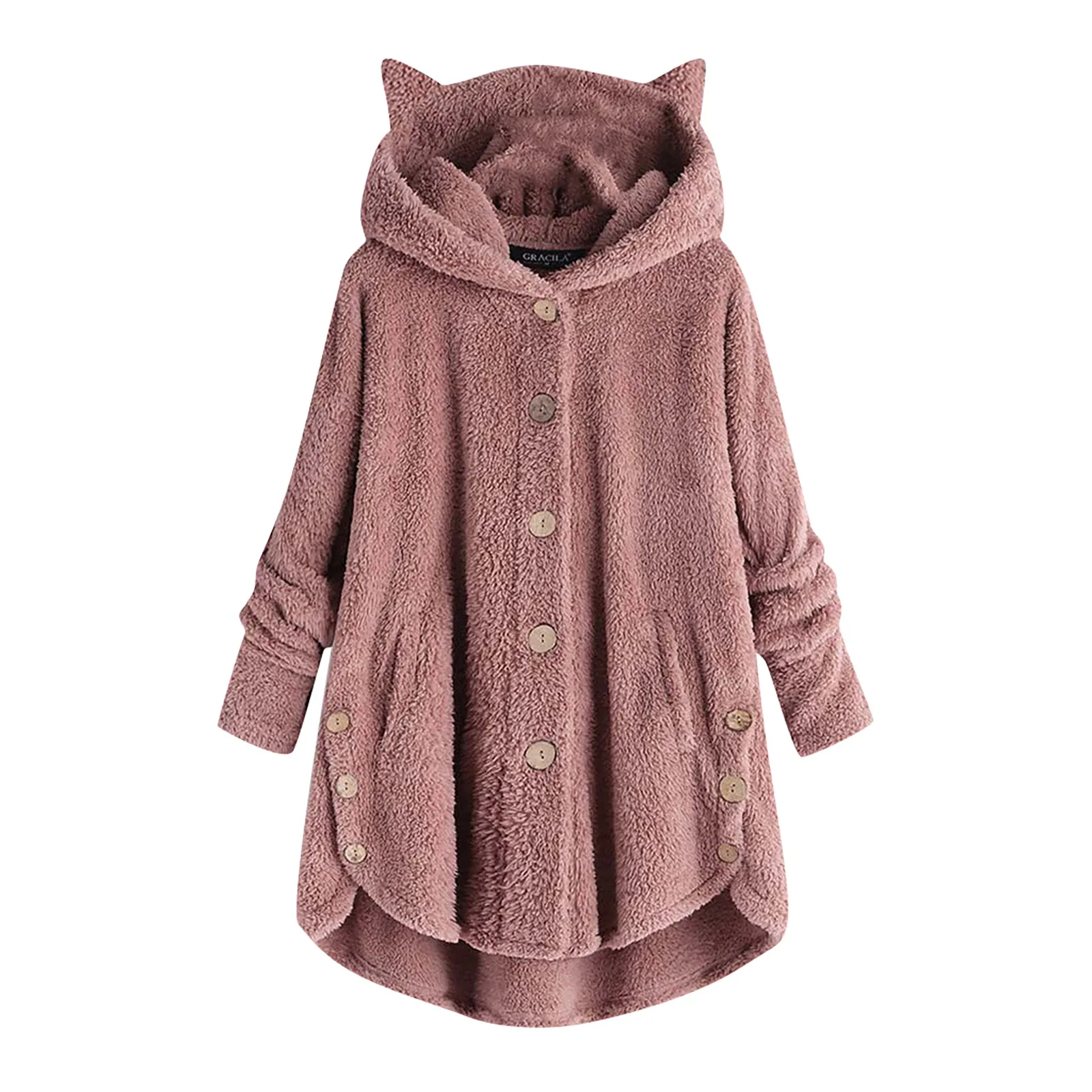 Женское зимнее плюшевое пальто размера плюс, асимметричное однотонное пальто с капюшоном, на пуговицах и с ушками, свободное Женское пальто